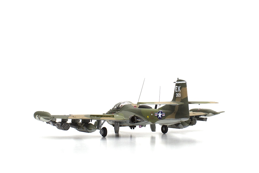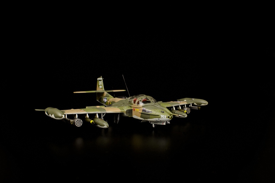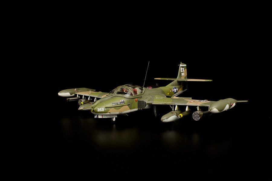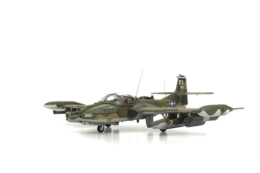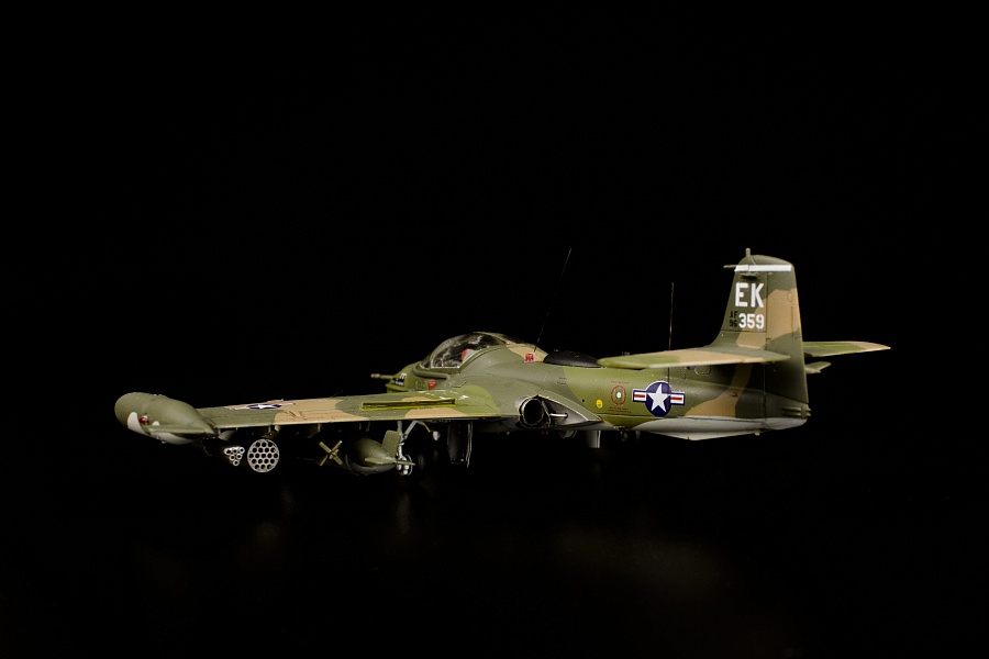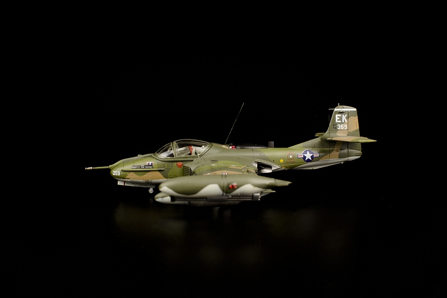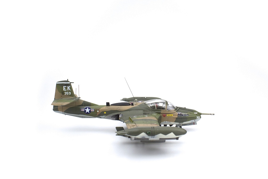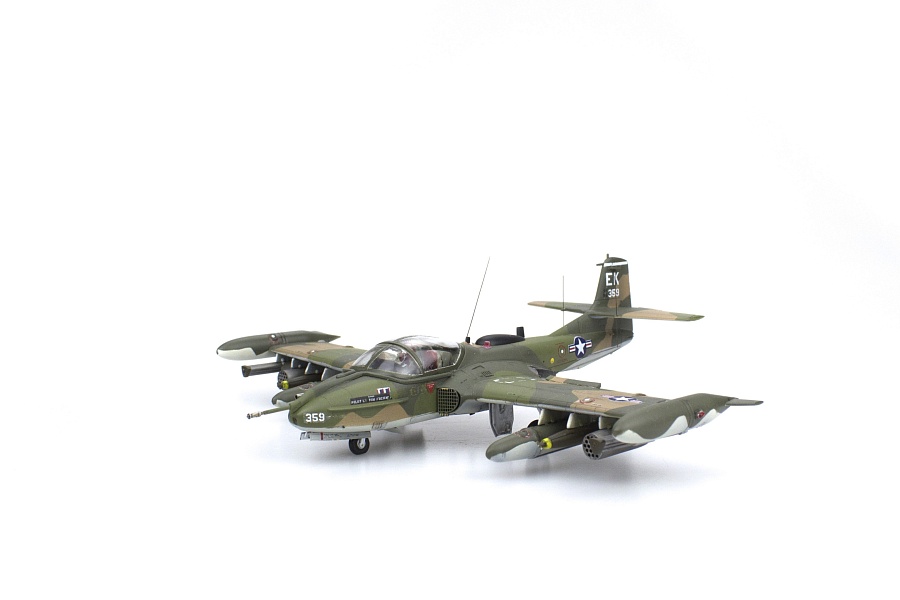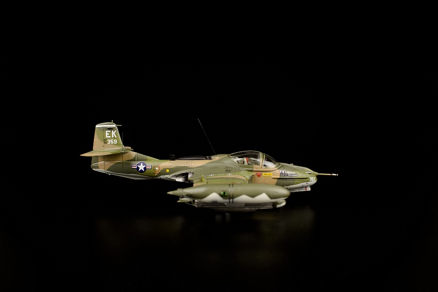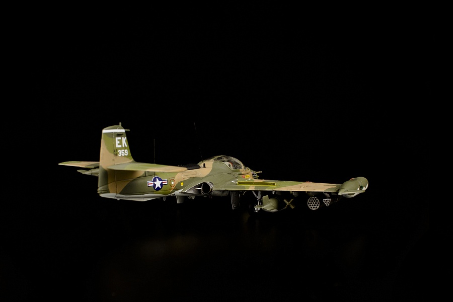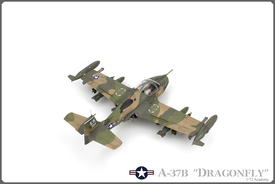 | Приветствую вас, уважаемые коллеги! После долгого перерыва в работе с пластиковыми моделями, связанного с постройкой галеона от DeAGOSTINI, решил вернуться к привычному для себя делу. Для этого выбрал из запасов несложную, на мой взгляд, модель от Academy в 72 масштабе - A-37B Dragonfly. Пластик старый, но аккуратный с внутренней расшивкой и какой-никакой детализацией. Насчет копийности, конечно, есть вопросы, хотя с чертежами не сравнивал. Особо вызвал отторжение набор вооружения и топливные баки, которые по геометрии совсем не то. Однако, целью было плавно вернуться к работе с пластиком, поэтому никаких запилов и конверсий не предполагалось. Набор покупался давно, а вместе с ним и фототравление от Eduard. К этой модели было бы неплохо разжиться и смоляным вооружением, но конский ценник на него в настоящее время и цель постройки расставили приоритеты. Итак по модели. Неплохая стыкуемость, шпатлевки минимум. КВ-антенны - щетинки из малярной кисти. Отделил колесо от передней стойки, было одной деталью. Не во всех местах удалось победить декаль. Набор травления очень даже хорошо вписался, однако детали, призванные имитировать сопла двигателей, ну совсем мимо. А сам заморачиваться тоже не стал. Натупил с хромат йеллоу в нишах интерцепторов. Отдельной проблемой стал слабый прижим купола антенны ADI. Осталась небольшая щель между куполом и фюзеляжем. Я побоялся прижать сильней, потому что клеил ее уже на практически готовую модель, и вышло это только со второго раза. А в первый раз треснул шов по стыку половинок фюзеляжа. Пришлось местно удалять ЛКП, заново шпатлевать и красить. Кабину не стал делать открытой, чтобы не портить силуэт этого воинственного малыша. Однако фонарь держится на micro liquitape от Microscale, поэтому в любой момент его можно снять. Как обычно вместо смывки получилось непонятно что. Надо набивать руку. В целом процесс сборки доставил удовольствие. Борт EK359 8-ой эскадрильи специальных операций 14-го крыла СО, ранее известного как бомбардировочного. Вообще, не смотря на размер, машина довольно грозная. Способность нести разнообразное вооружение в совокупности с его количеством и маневренностью делали этот легкий штурмовик опасной угрозой с неба для вьетнамских наземных сил. В работе использовались акрил от mr.hobby, Футура, смывка, клеи и жидкость для декалей от Tamiya. Спасибо за внимание к модели. |