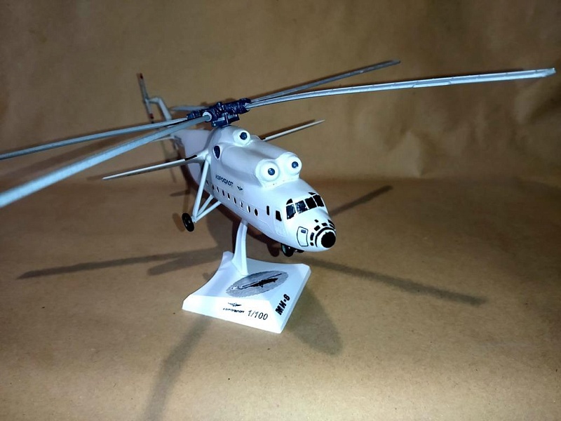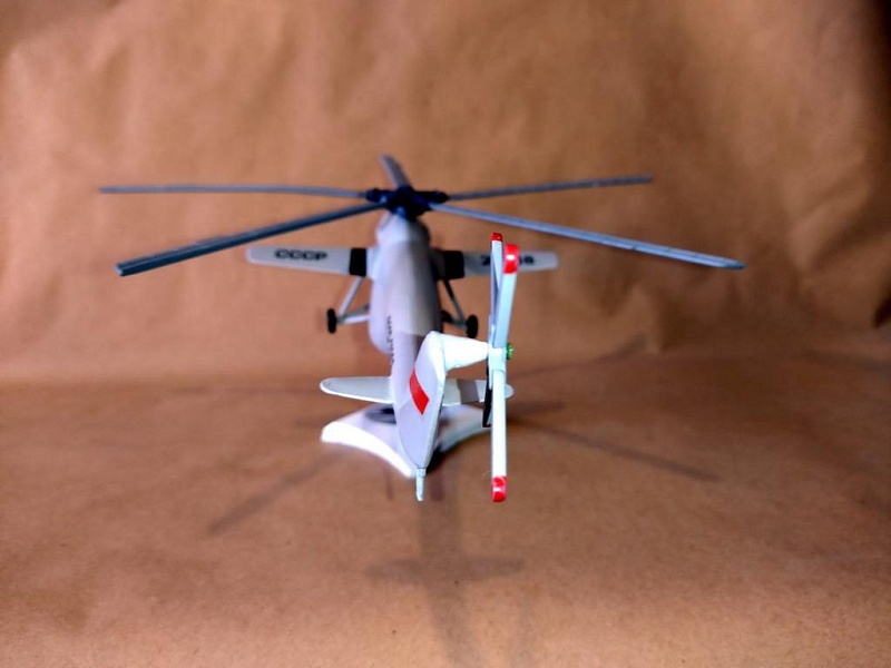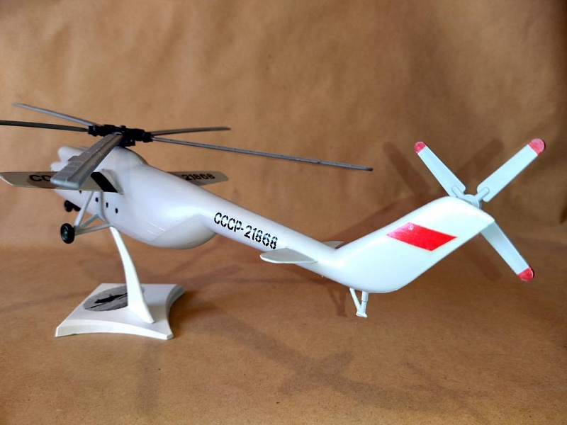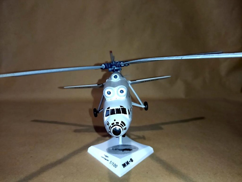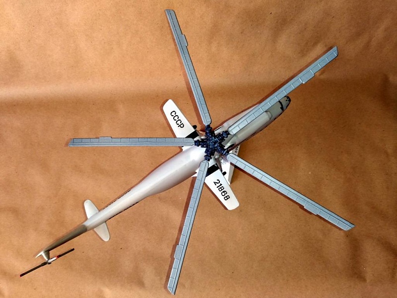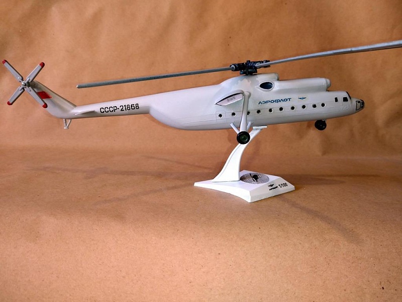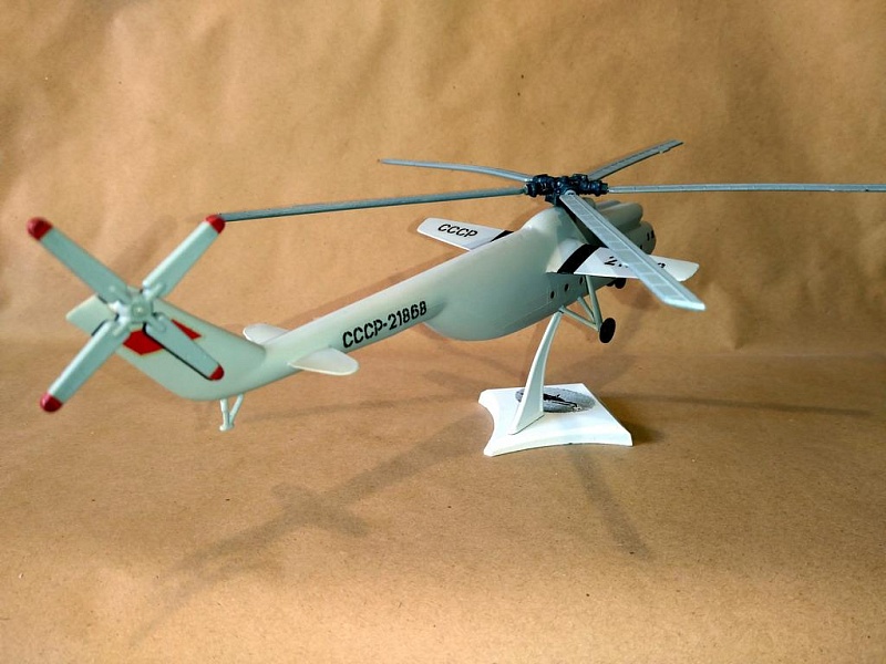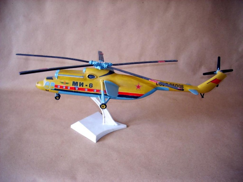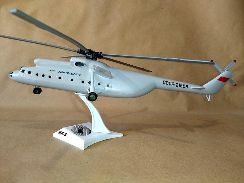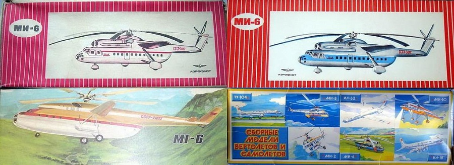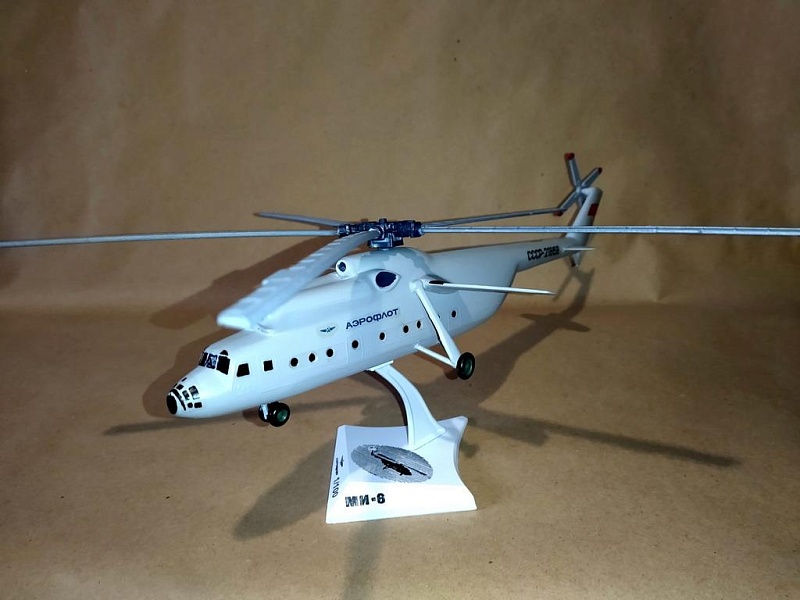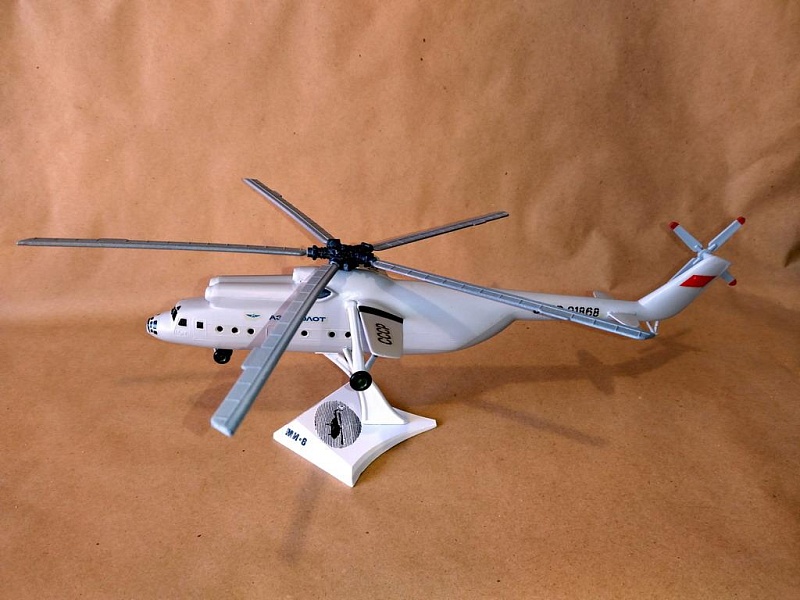 Всех приветствую. Показываю очередное ретро-поделие – вертолёт Ми-6 в 1/100 от «Кругозора». О самом вертолёте говорить не стану ввиду его широкой известности. Хотя нет, о его применении в гражданской авиации всё же стоит рассказать, это весьма любопытно. На цивильную службу Ми-6 поступили почти одновременно с появлением в армии. И в Гражданской авиации освоение вертолёта шло куда быстрее, нежели в ВВС, квалификация гражданских экипажей была выше нежели военных, годовой налёт - в разы больше, 600-800 часов против 100-200. Абсолютное большинство гражданских Ми-6 поступили в авиаотряды, расположенные за Уралом или на Севере. Они эксплуатировались авиаторами Архангельска, Сыктывкара, Салехарда, Надыма, Сургута, Нижневартовска, Тюмени, Норильска, Ухты, Красноярска, Хабаровска, Якутска и Ашхабада. Единственным исключением из этого правила стало лидировавшее при освоении вертолета авиапредприятие из подмосковного Мячково. Экипажи практически всех отрядов побывали в районах освоения новых нефтегазовых месторождений и на других эпохальных советских стройках. С дорогами там обстояло, мягко говоря, не очень и фантастические по тем временам возможности Ми-6 пришлись очень кстати. Применение Ми-6 в ГВФ имело одну особенность, отличавшую их от военных. В ВВС перевозка грузов на внешней подвеске практиковалась редко, в основном при эвакуации потерпевших аварию летательных аппаратов. А для аэрофлотовских бортов такая перевозка стала будничной. И причина тут крылась не только в большом количестве негабаритных грузов. Другая причина - слишком долгое время загрузки грузовой кабины, до 4-х часов, ведь надо всё тщательно разместить, пришвартовать. Да и разгрузка могла занять до 2-х часов. Потому загружали контейнер, который Ми-6 и тащил куда надо. Из других грузов, перевозимых на внешней подвеске, наиболее сложными для транспортировки были «балкѝ» - сваренные из металла жилые модули весом 9 тонн. При максимально допустимых для внешней подвески 8 тоннах. Также Ми-6 возили в разобранном виде буровые вышки, тут наибольшую сложность представляли опоры вышек, весом 8 тонн и длиной 40 метров. А ещё трубы большого диаметра длиной более 30 метров и весом около 7 тонн. Плюс много чего ещё, разного рода оборудование, технику и всё прочее. Использовались Ми-6 и в качестве летающих кранов. Вертолёты для выполнения различных задач нередко облегчали, с них снимали крыло, в некоторых случаях - створки грузолюка и подвесные баки. Теперь о модели. Которая была выпущена Московским заводом металлической и пластмассовой игрушки где-то в середине 60-х годов. Как и в случае многих других советских сборных моделей, её сделали на основе сувенирного макета, полученного из ОКБ Миля. Кстати, с неплохой геометрией. Впоследствии модель выпускал «Юный Техник», а с середины 70-х годов «Кругозор». Также модель одно время перепаковывалась ГДРовской фирмой DIWI. Модель за время выпуска менялась. И, увы, не в лучшую сторону. Особенно это касается винтов, несущего и рулевого, которые унифицировали с таковыми от кругозоровского же Ми-8 в 1/50. Также изменилась подставка. Выпуск модели прекратился в 90-х годах. Пресс-форму, вероятно, сдали в металлолом. Во всяком случае, на «Алангере» она уже не всплыла. В детстве у меня такой модели не было. Этот экземпляр я приобрёл на барахолке. На пластикартовской подставк