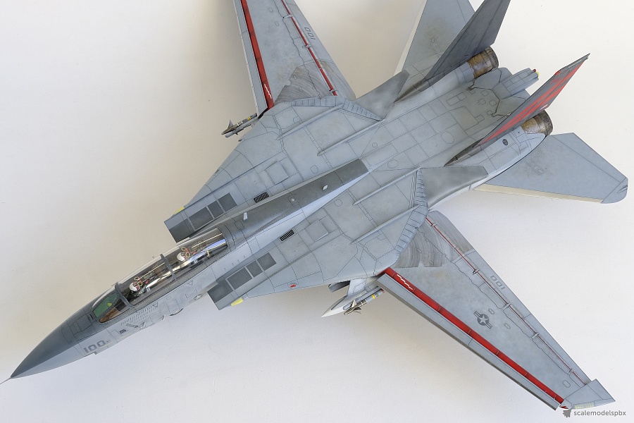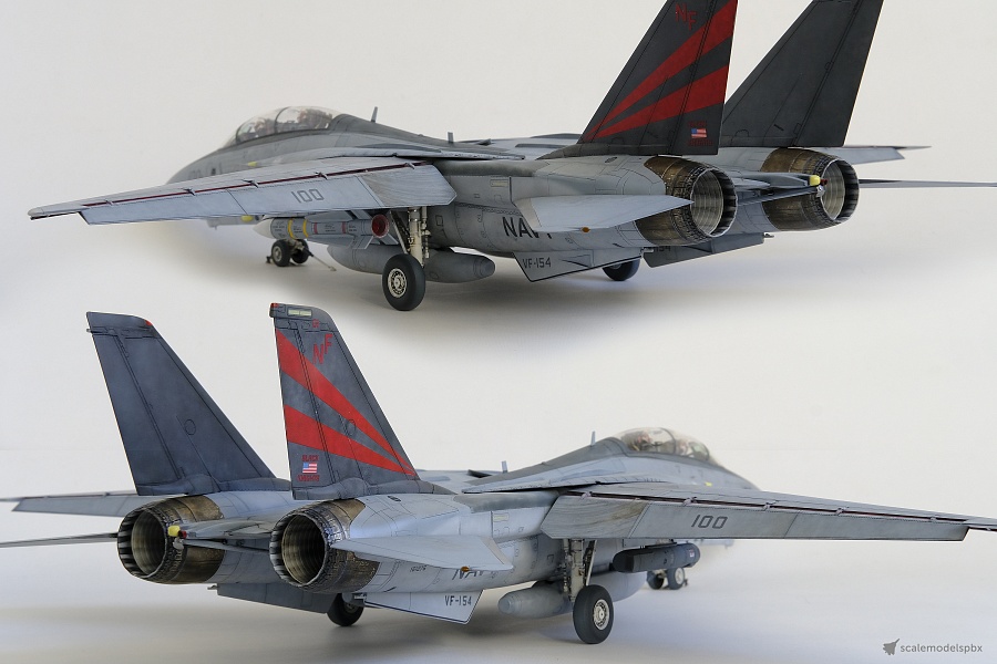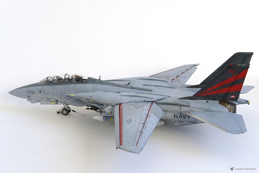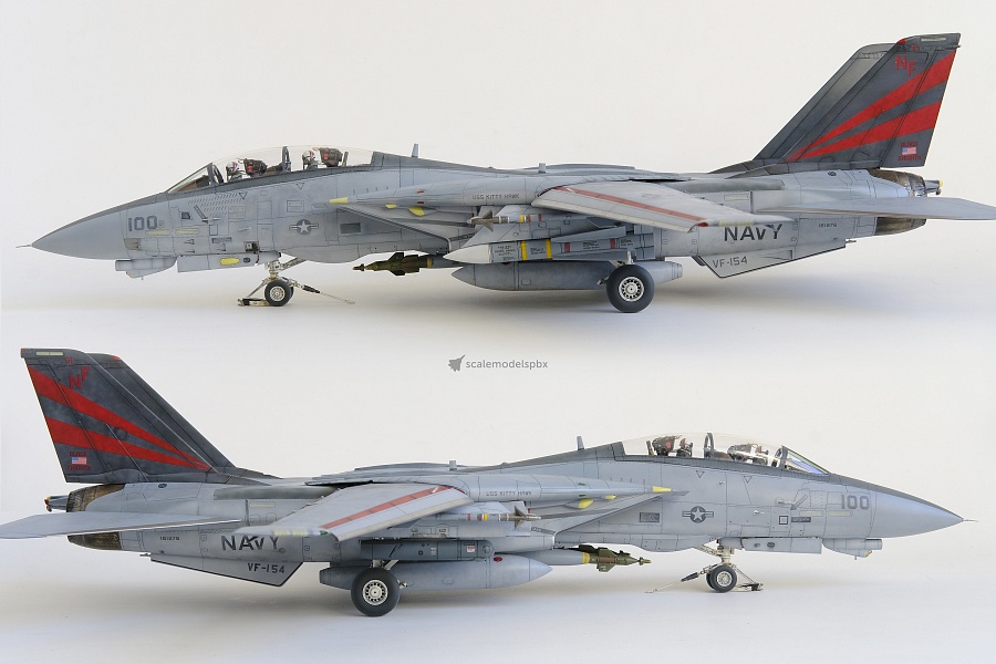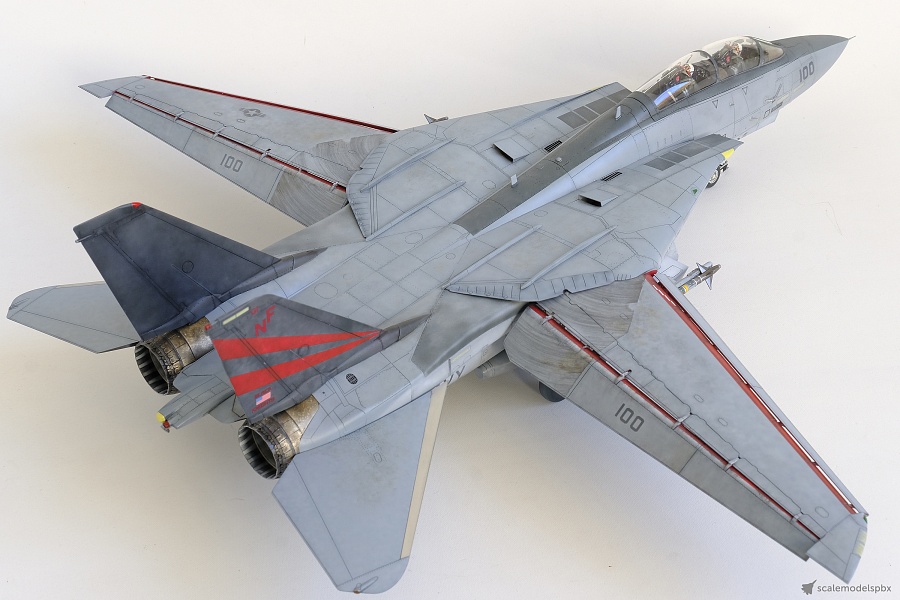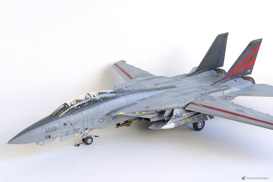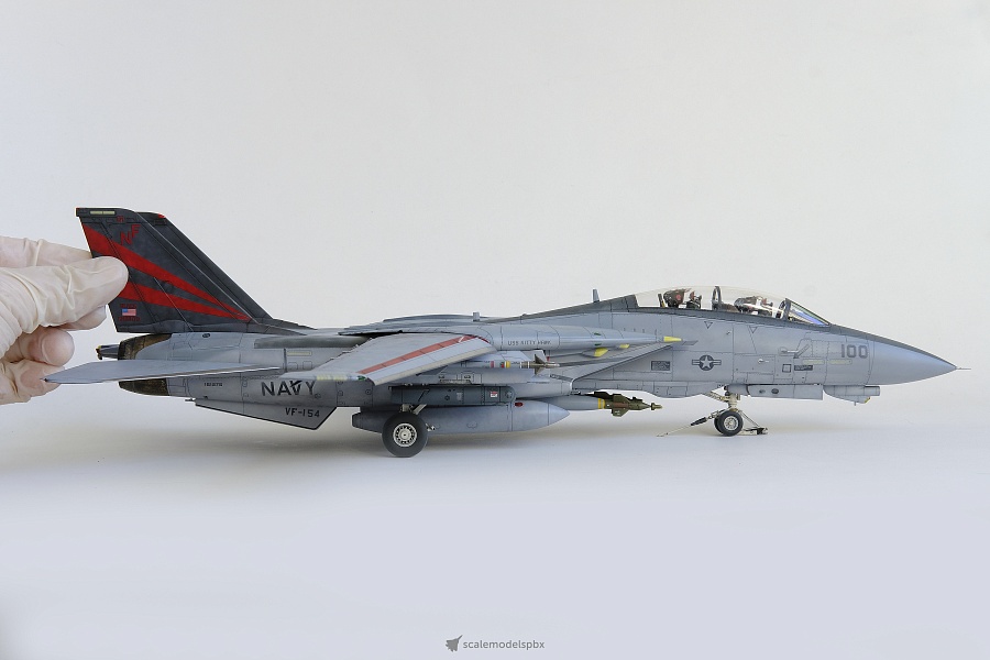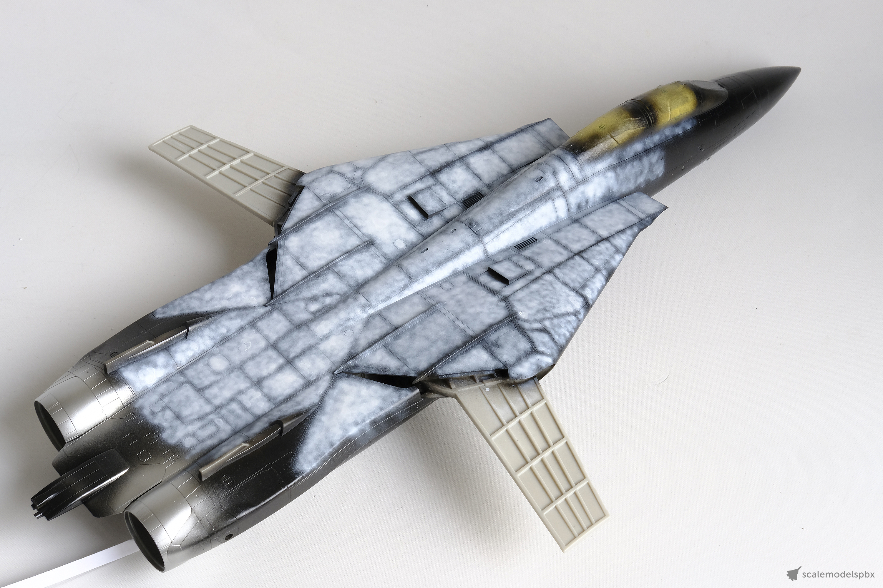 Всем привет! Закончилось лето, а вместе с ним и небольшой отпуск. Руки дотянулись до очередной новой коробки. На этот раз это относительная новинка от Tamiya Grumman F-14A Tomcat. В качестве прототипа решил остановиться на машине с поздней современной окраской в холодных, серо-голубых тонах из состава VF-154 Черных рыцарей. Этот вариант Tamiya представила в режиме старта с фигурками пилотов и тех. персонала. Довольно долго возился с кабиной. Показалось, что более насыщена деталями, чем у остальных машин. В наборе использовал декали от Quinta Studio. Тут пришлось совмещать оба набора, поскольку Quinta дает в комплекте выключенные мониторы. Включил их при помощи штатных от Тамии. Не большой специалист в росписи фигурок, а точнее вообще профан, сделал как сумел. Стыкуется и собирается как всегда предсказуемо и хорошо. Самолет насыщен деталями, которые требуют времени на проработку. Раскрытое крыло с раздельной окраской делал почти неделю. Хорошо, что все это оперенье можно красить отдельно от основного корпуса, стыковка частей на сухую просто идеальна. Тамия, что тут скажешь. Сама модель большого размера, частями красить удобно. Сделал вооружение на машину с 100 номером, Тамия в таком окрасе предлагает делать самолет разведчик 101, но захотелось более пестрого арсенала с ассиметричным подвесом гостинцев. Закончил работать со стойками шасси и створками, покрасил, добавил смывку и тонировку, где возможно провел гидравлику. Буквально за несколько часов собрал весь корпус, ни одной щели и перепада высот, ну может в нескольких местах прошел шлифовальной губкой в 1500 единиц. Превосходно продумано членение, сделано так, что даже не приходится возиться с восстановлением расшивки. Похоже, что при любых новинках от Тамии вопрос покупки становится очевидным. Задул черным и начал наносить мраморную крошку. На картинки, которые предлагает Тамия я ориентировался справочно, больше смотрел фотографии этих машин. Окраска у поздних котов судя по всему была по современным стандартам США и эти цвета я покупал для ранее собранного F-16. В работе использовал краски от GSI, 306, 307, 137, 316. Но все эти оттенки пришлось мешать из набора банок. Верх - серо-голубой, это готовая 307, низ мне показался почти белым, очень светлый, пришлось мешать из белой 316, и серой 306 (где-то 50/50), темно-серый это тоже микс 137 (серая резина) вместе с 316. Тамия еще предлагает промежуточный цвет, между низом и верхом, но судя по фотографиям он настолько незаметен, что я не делал сильного контраста между этими частями. Нанес лак, декали и сделал смывку по швам. Декали предсказуемо капризничали, но в целом получилось нормально. Добавил немного следов эксплуатации при помощи масла и смывок, без фанатизма. По финалу стройки могу сказать, что это очередная замечательная модель от Тамии, горячо рекомендую к покупке, несмотря на значительный ценник своих денег эта коробка стоит. Приятного просмотра!