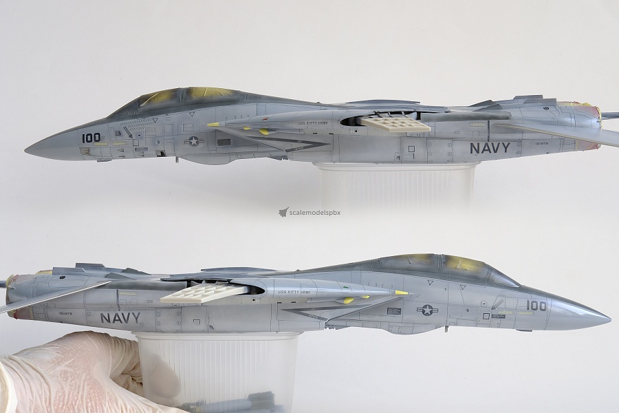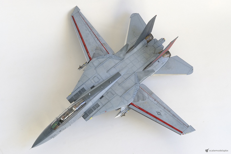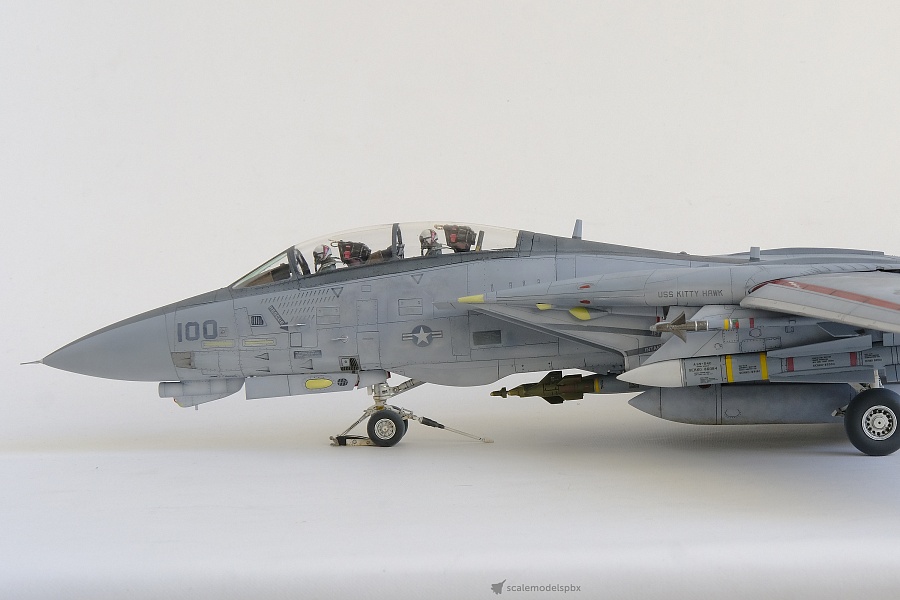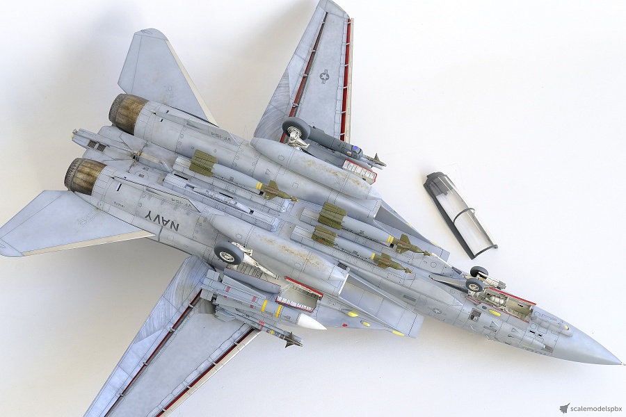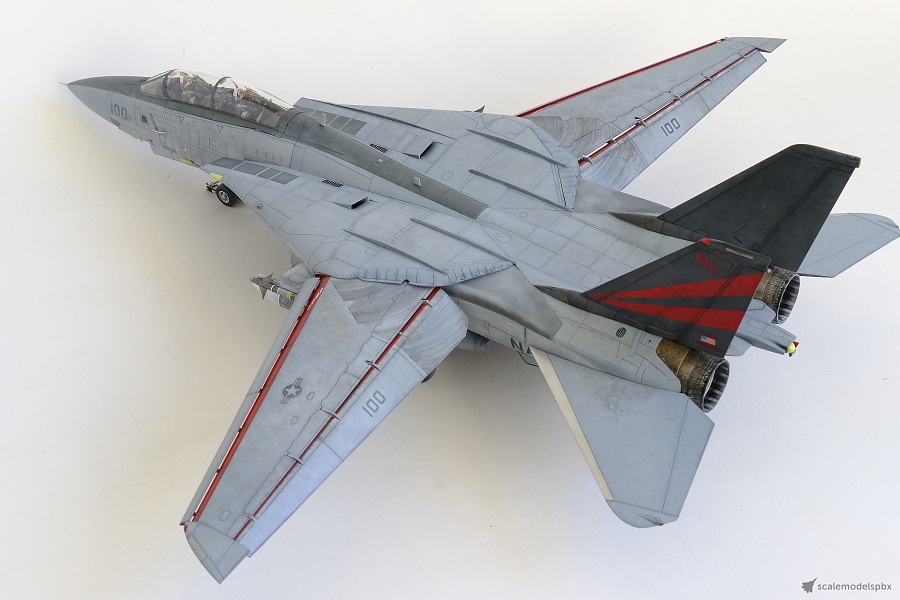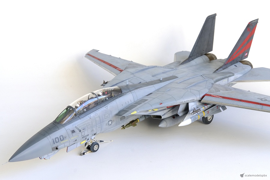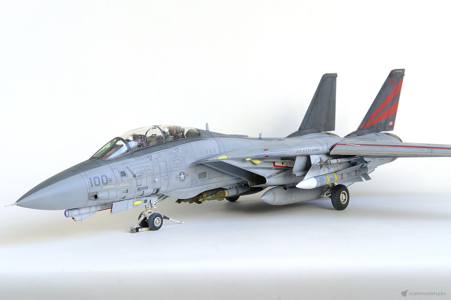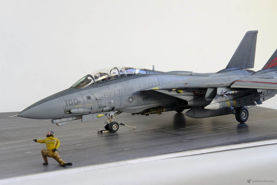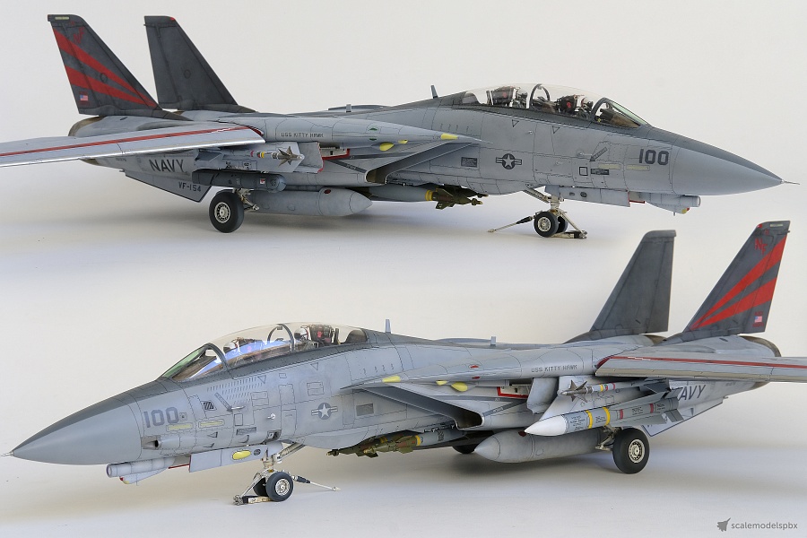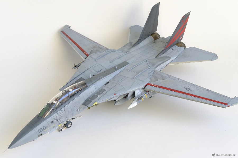 Всем привет! Закончилось лето, а вместе с ним и небольшой отпуск. Руки дотянулись до очередной новой коробки. На этот раз это относительная новинка от Tamiya Grumman F-14A Tomcat. В качестве прототипа решил остановиться на машине с поздней современной окраской в холодных, серо-голубых тонах из состава VF-154 Черных рыцарей. Этот вариант Tamiya представила в режиме старта с фигурками пилотов и тех. персонала. Довольно долго возился с кабиной. Показалось, что более насыщена деталями, чем у остальных машин. В наборе использовал декали от Quinta Studio. Тут пришлось совмещать оба набора, поскольку Quinta дает в комплекте выключенные мониторы. Включил их при помощи штатных от Тамии. Не большой специалист в росписи фигурок, а точнее вообще профан, сделал как сумел. Стыкуется и собирается как всегда предсказуемо и хорошо. Самолет насыщен деталями, которые требуют времени на проработку. Раскрытое крыло с раздельной окраской делал почти неделю. Хорошо, что все это оперенье можно красить отдельно от основного корпуса, стыковка частей на сухую просто идеальна. Тамия, что тут скажешь. Сама модель большого размера, частями красить удобно. Сделал вооружение на машину с 100 номером, Тамия в таком окрасе предлагает делать самолет разведчик 101, но захотелось более пестрого арсенала с ассиметричным подвесом гостинцев. Закончил работать со стойками шасси и створками, покрасил, добавил смывку и тонировку, где возможно провел гидравлику. Буквально за несколько часов собрал весь корпус, ни одной щели и перепада высот, ну может в нескольких местах прошел шлифовальной губкой в 1500 единиц. Превосходно продумано членение, сделано так, что даже не приходится возиться с восстановлением расшивки. Похоже, что при любых новинках от Тамии вопрос покупки становится очевидным. Задул черным и начал наносить мраморную крошку. На картинки, которые предлагает Тамия я ориентировался справочно, больше смотрел фотографии этих машин. Окраска у поздних котов судя по всему была по современным стандартам США и эти цвета я покупал для ранее собранного F-16. В работе использовал краски от GSI, 306, 307, 137, 316. Но все эти оттенки пришлось мешать из набора банок. Верх - серо-голубой, это готовая 307, низ мне показался почти белым, очень светлый, пришлось мешать из белой 316, и серой 306 (где-то 50/50), темно-серый это тоже микс 137 (серая резина) вместе с 316. Тамия еще предлагает промежуточный цвет, между низом и верхом, но судя по фотографиям он настолько незаметен, что я не делал сильного контраста между этими частями. Нанес лак, декали и сделал смывку по швам. Декали предсказуемо капризничали, но в целом получилось нормально. Добавил немного следов эксплуатации при помощи масла и смывок, без фанатизма. По финалу стройки могу сказать, что это очередная замечательная модель от Тамии, горячо рекомендую к покупке, несмотря на значительный ценник своих денег эта коробка стоит. Приятного просмотра!