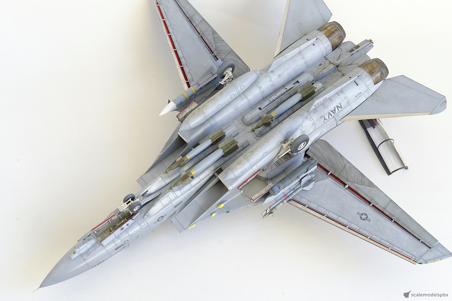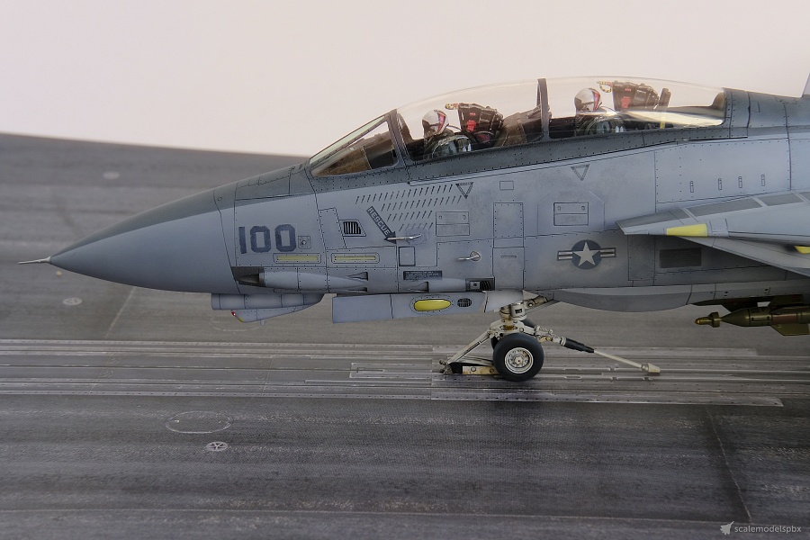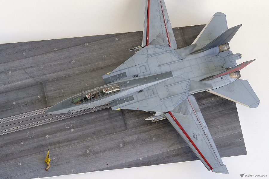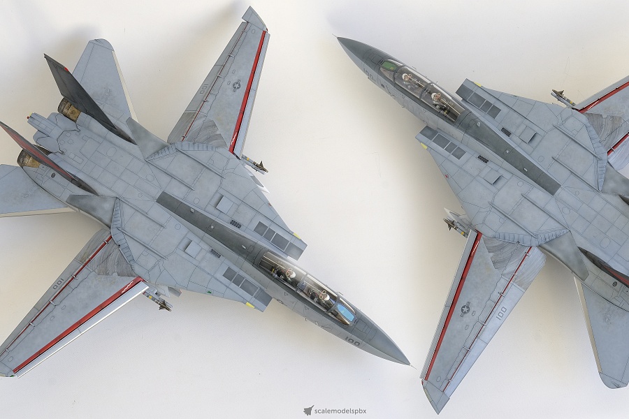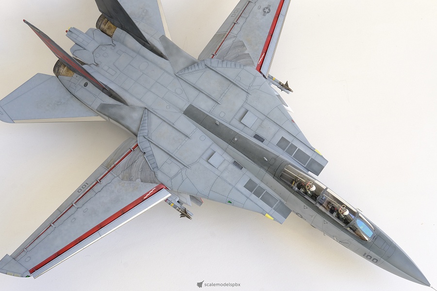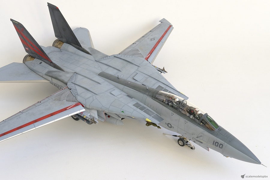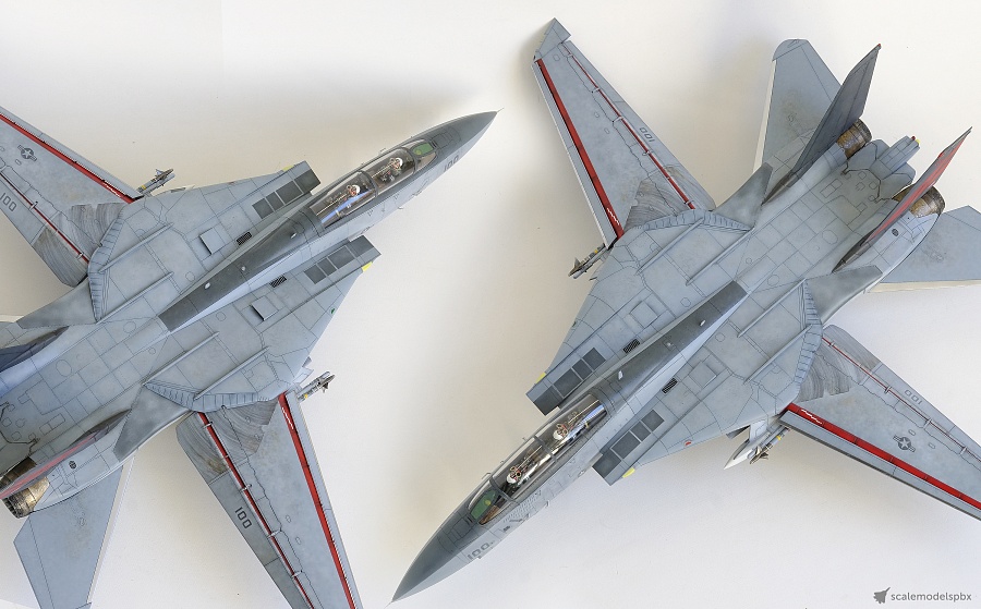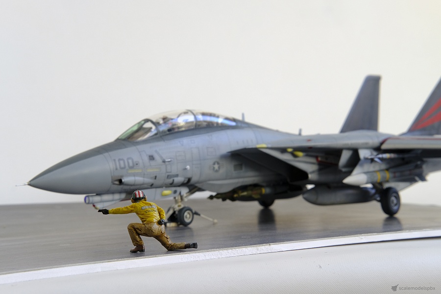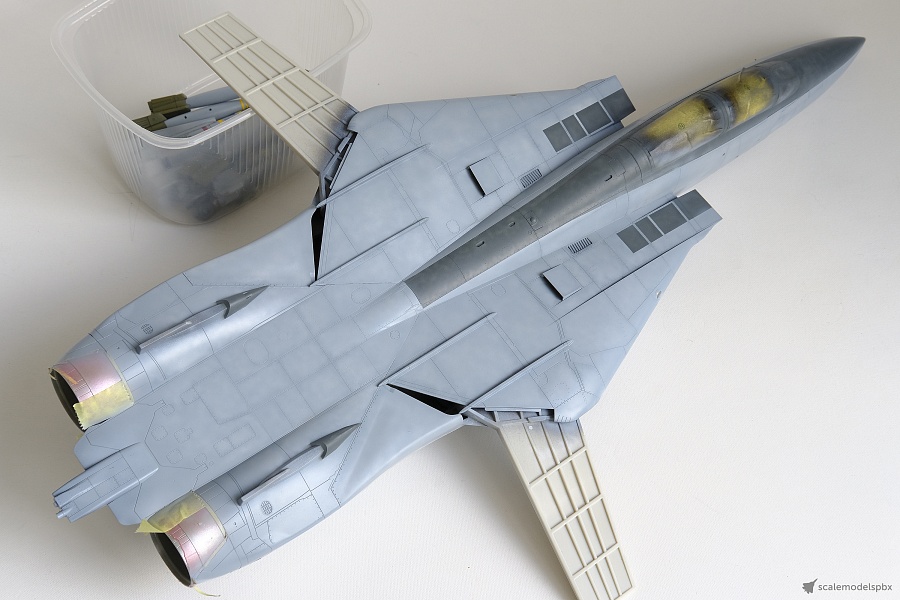 Всем привет! Закончилось лето, а вместе с ним и небольшой отпуск. Руки дотянулись до очередной новой коробки. На этот раз это относительная новинка от Tamiya Grumman F-14A Tomcat. В качестве прототипа решил остановиться на машине с поздней современной окраской в холодных, серо-голубых тонах из состава VF-154 Черных рыцарей. Этот вариант Tamiya представила в режиме старта с фигурками пилотов и тех. персонала. Довольно долго возился с кабиной. Показалось, что более насыщена деталями, чем у остальных машин. В наборе использовал декали от Quinta Studio. Тут пришлось совмещать оба набора, поскольку Quinta дает в комплекте выключенные мониторы. Включил их при помощи штатных от Тамии. Не большой специалист в росписи фигурок, а точнее вообще профан, сделал как сумел. Стыкуется и собирается как всегда предсказуемо и хорошо. Самолет насыщен деталями, которые требуют времени на проработку. Раскрытое крыло с раздельной окраской делал почти неделю. Хорошо, что все это оперенье можно красить отдельно от основного корпуса, стыковка частей на сухую просто идеальна. Тамия, что тут скажешь. Сама модель большого размера, частями красить удобно. Сделал вооружение на машину с 100 номером, Тамия в таком окрасе предлагает делать самолет разведчик 101, но захотелось более пестрого арсенала с ассиметричным подвесом гостинцев. Закончил работать со стойками шасси и створками, покрасил, добавил смывку и тонировку, где возможно провел гидравлику. Буквально за несколько часов собрал весь корпус, ни одной щели и перепада высот, ну может в нескольких местах прошел шлифовальной губкой в 1500 единиц. Превосходно продумано членение, сделано так, что даже не приходится возиться с восстановлением расшивки. Похоже, что при любых новинках от Тамии вопрос покупки становится очевидным. Задул черным и начал наносить мраморную крошку. На картинки, которые предлагает Тамия я ориентировался справочно, больше смотрел фотографии этих машин. Окраска у поздних котов судя по всему была по современным стандартам США и эти цвета я покупал для ранее собранного F-16. В работе использовал краски от GSI, 306, 307, 137, 316. Но все эти оттенки пришлось мешать из набора банок. Верх - серо-голубой, это готовая 307, низ мне показался почти белым, очень светлый, пришлось мешать из белой 316, и серой 306 (где-то 50/50), темно-серый это тоже микс 137 (серая резина) вместе с 316. Тамия еще предлагает промежуточный цвет, между низом и верхом, но судя по фотографиям он настолько незаметен, что я не делал сильного контраста между этими частями. Нанес лак, декали и сделал смывку по швам. Декали предсказуемо капризничали, но в целом получилось нормально. Добавил немного следов эксплуатации при помощи масла и смывок, без фанатизма. По финалу стройки могу сказать, что это очередная замечательная модель от Тамии, горячо рекомендую к покупке, несмотря на значительный ценник своих денег эта коробка стоит. Приятного просмотра!
