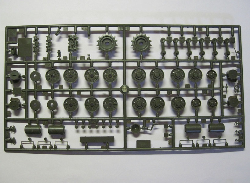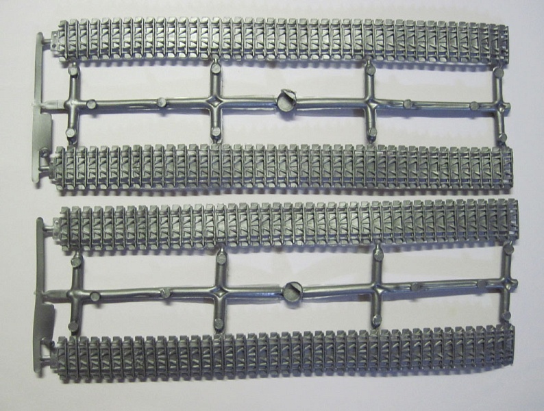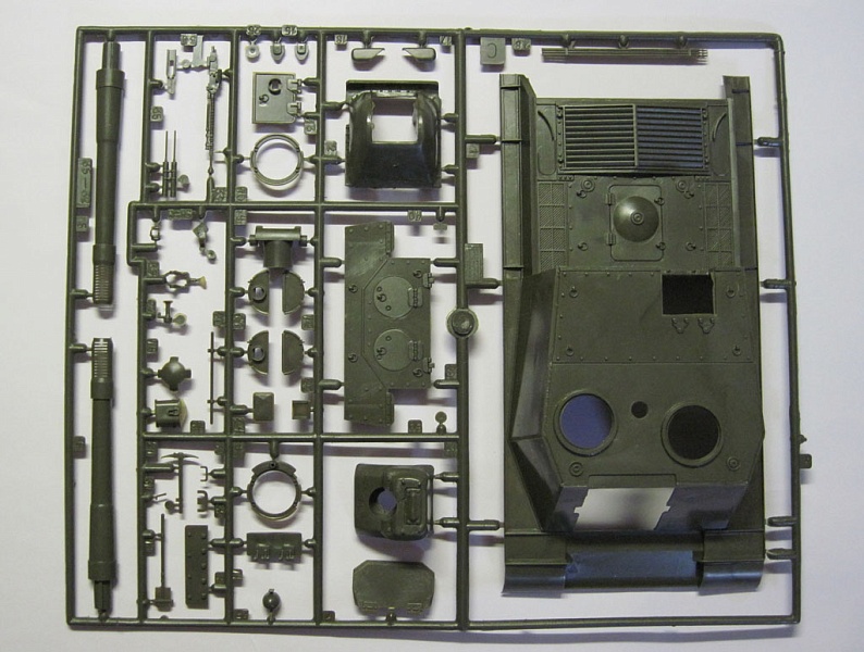 Модель находится в коробке среднего размера из достаточно тонкого картона. Верхняя часть коробки глянцевая. Внутри находятся 4 литника с деталями из зеленого пластика (2 литника с элементами ходовой идентичны), 2 литника из серого резиноподобного материала с гусеничными лентами (наборных гусениц в комплекте нет, надо докупать отдельно), малюсенькая декалька и на удивления небольшая инструкция на одном листе формата А4.