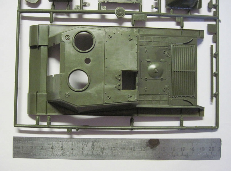 Удивляет очень куцая декаль, включающая в себя только две цифры "7". В инструкции же дается схема окраски и нанесения декалей для какой-то безымянной самоходки непонятно какого исторического периода и непонятно с какого участка фронта. Работники "Звезды", вам самим-то не стыдно так относится к легендарной самоходке, на которой наши деды Берлин брали? Так же не понравилось абсолютно голое днище модели и отсутствие деталей из прозрачного пластика для остекления фар (да и приборы наблюдения МК-4 из прозрачного пластика тоже не были бы лишними). Кроме того не совсем понятно, что мешает "Звезде" дополнить свой набор деталями для альтернативной сборки ИСУ-122 (и (или) даже ИСУ-122С) и тем поднять его привлекательность для покупателей.