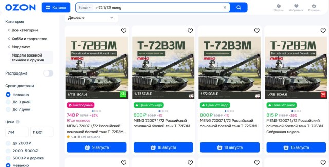 ак бы то ни было, российский покупатель теперь может выбрать Т-72: MENG за 800 или "Звезду" за 1490. Можешь не отвечать - я наперёд знаю звездофильские агитки про "у китайцев игрушки по мотивам, а у "Звезды" суперкопийность ". При этом никаких аргументов (типа сравнения с прототипом) не приводится, а явные косяки "суперкопийных" во внимание не принимаются.