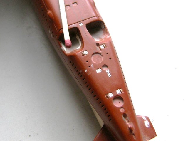 Получив некоторый опыт по восстановлению палубных шпигатов, продолжил их восстановление теперь уже на палубе кормовой надстройки. По фотографиям восстановил близкую к истине схему палубных шпигатов кормовой надстройки.     Окончательно высверлил палубные шпигаты в палубе кормовой надстройки сверлом 0,3 мм и глубиной 0,5 мм. Процесс сверления несколько осложняли более сложная форма и уклон палубы кормовой надстройки до 12 градусов вниз по сравнению с палубой кормовых ракетных контейнеров. .     Теперь палуба кормовой надстройки несколько изменила свой вид.           С уважением…