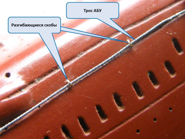 По желобу сделал 40 отверстий Ø 0,2 мм глубиной 1,0 мм под разгибающиеся скобы, которыми буксирный трос крепился в желобе АБУ.