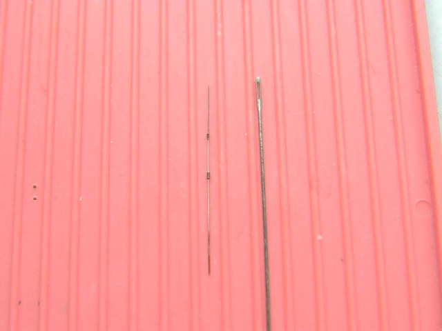 Собрал все детали вместе и поскольку элементы конструкции не испытывают значительных нагрузок, скрепил лаком "Plastik-71". Для сравнения выложил иглу для бисера Ø 0,4мм.