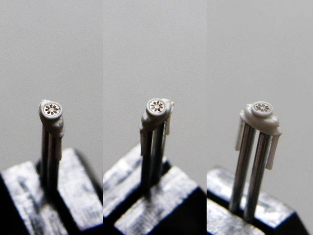 На третьей модели подводной лодки делаю датчик МГ-23 ГИСЗ (гидроакустическая станция измерения скорости звука) "Береста" (на сленге подводников - Рога) и если с защитной сеткой почти удалось справиться, то форма самого датчика оставляла желать лучшего (ссылка, пост 241 https://karopka.ru/forum/messages/forum190/topic27898/message1431805/#message1431805 ). Отчасти причиной этого был малый размер - не более 1,5 мм.