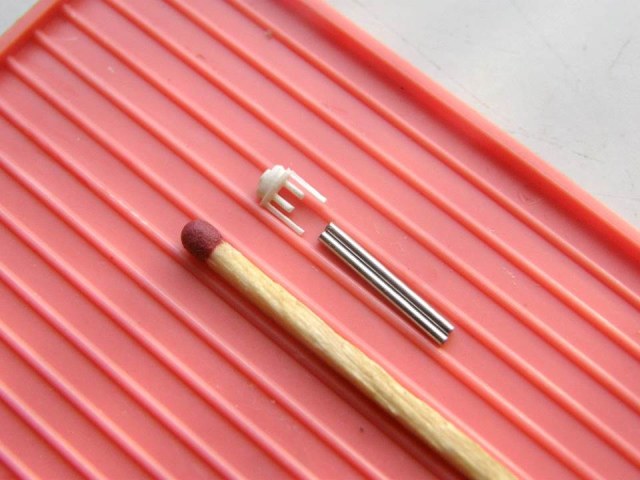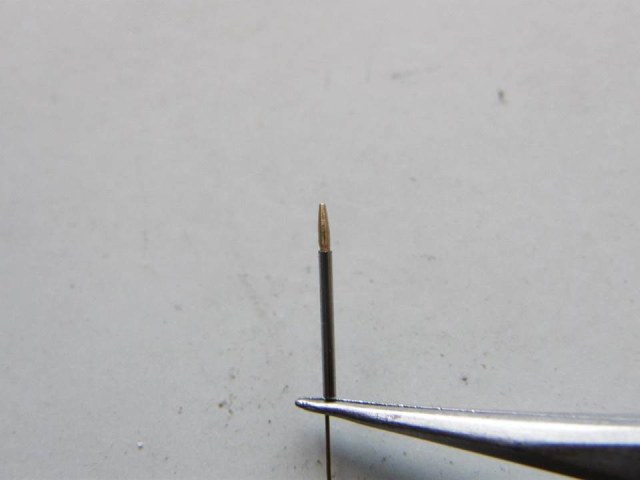 Толстостенную латунную трубку Ø0,35 мм с внутренним Ø0,1 мм обрезал до длины 1,3 мм и пилкой сделал с одной стороны надпилы глубиной 0,2 мм.