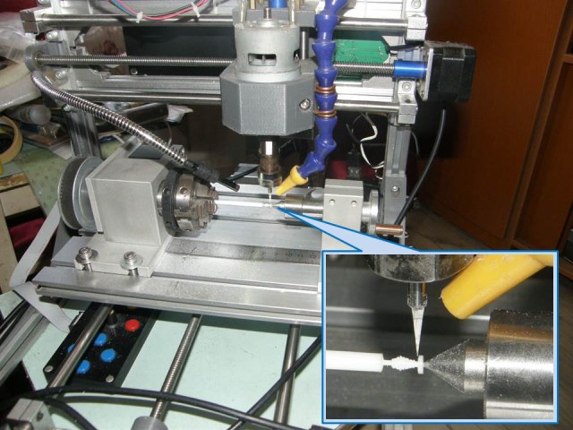 На этот раз решил выполнить ВУ СОРС Накат-М с помощью станка с ЧПУ. Для этого потребовалось сделать ряд подготовительных работ и станок из трехосного переделать в четырехосный. Трудность заключалась в том, что этот тип станка еще никто не делал в четырехосном варианте. В общем, пришлось воевать как в Первой конной. "Прикрутил" четвертую ось, установив переднюю бабку с 4-х кулачковым патроном и заднюю бабку, ну и само собой - плату управления.