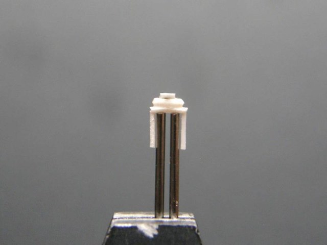 Из обрезка леера сделал хомут, обогнув его на проволоке Ø0,3 мм, и кончики вставил в отверстие трубки-основания. Тем белее, что хомут на фотографиях прототипа ярко выражен. Рога, выходящие из трубки, подогнул так, чтобы проволока была на расстоянии 0,1 мм от торца трубки.