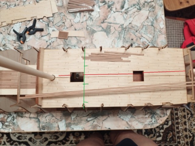 Ещё не поздно поверх лазерной палубы наклеить планки, показывая правильное расположение поперечных стыков досок. Судя по фотографиям в сообщ. 34, у Вас это отлично получается.