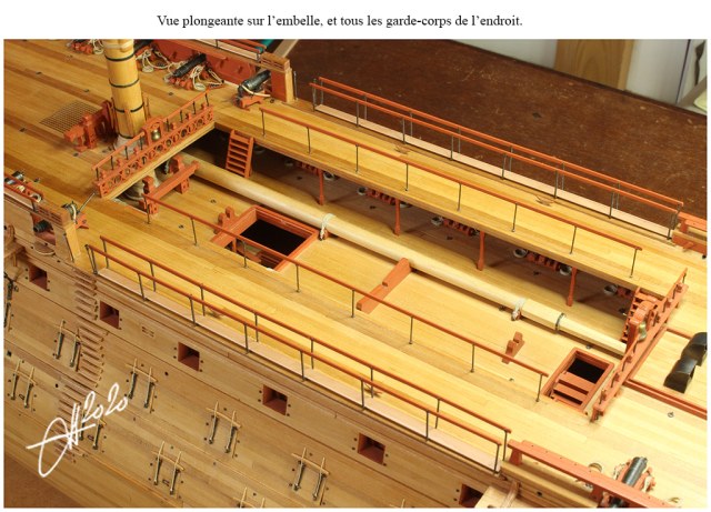 Единственное, останется загадкой конструкция новых мостиков шкафута под добавленные орудия. Я думаю, что мостики были не "старые, к которым добавили ширины", а, что мне видится логичным, настелены заново, скорее, на новые бимсы, а-ля "скид-бимсы", как сейчас такие установлены на шкафуте на корабле-музее "Виктори". Но нарубные поясья, идущие одними линиями через форкастль, края старых мостиков шкафута и продолжались на квартердеке (иногда совпадая в одну линию, иногда, как на фото ниже, нет), они остались на старых местах.
