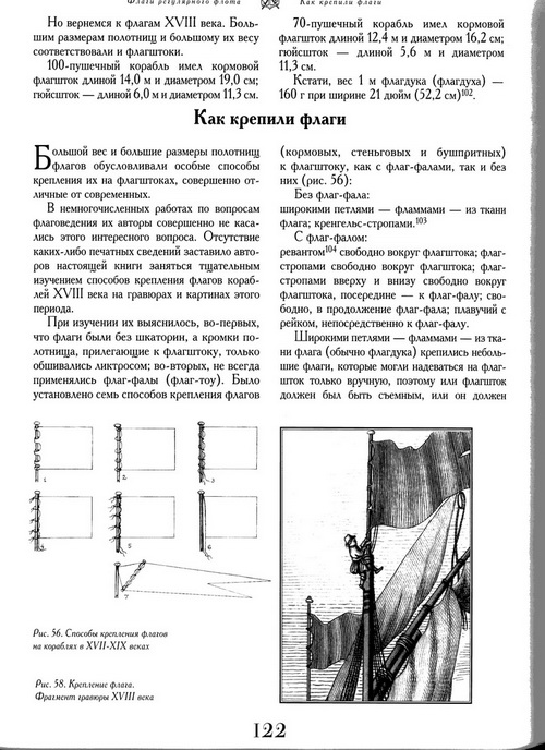 Дык, там понятно или мне так показалось. Ребята, видимо, «наскальные картинки» основательно изучали и пришли к выводу, что до 1675 года фалы для быстрого под’ема-спуска флагов (в основном, сигнальных) не использовались. Либо использовался рукав для натягивания на флагшток, либо вшитые через небольшие промежутки коуши. И флаг крепился в топе к флагштоку. На фото: выдержка из книжки с соответствующими картинками. Понятно, что это бриты. У тебя с инглишем ОК, насколько понимаю. BRGDS