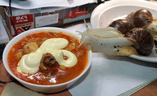 Сегодня менял субстрат в террариуме,отсадил улиток в миску.Провозился минут 10,вернулся и застал такую картину.На фотке не сильно видно,но у обеих щачлы были в следах борща.