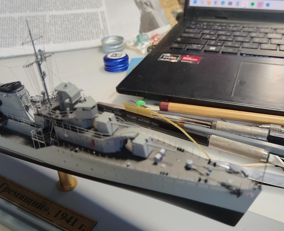 Эсминец пр. 7- осталось протащить леера сквозь колечки во вклеенных стойках. Такого жирного суслика я ещё в жизни не откармливал!)))