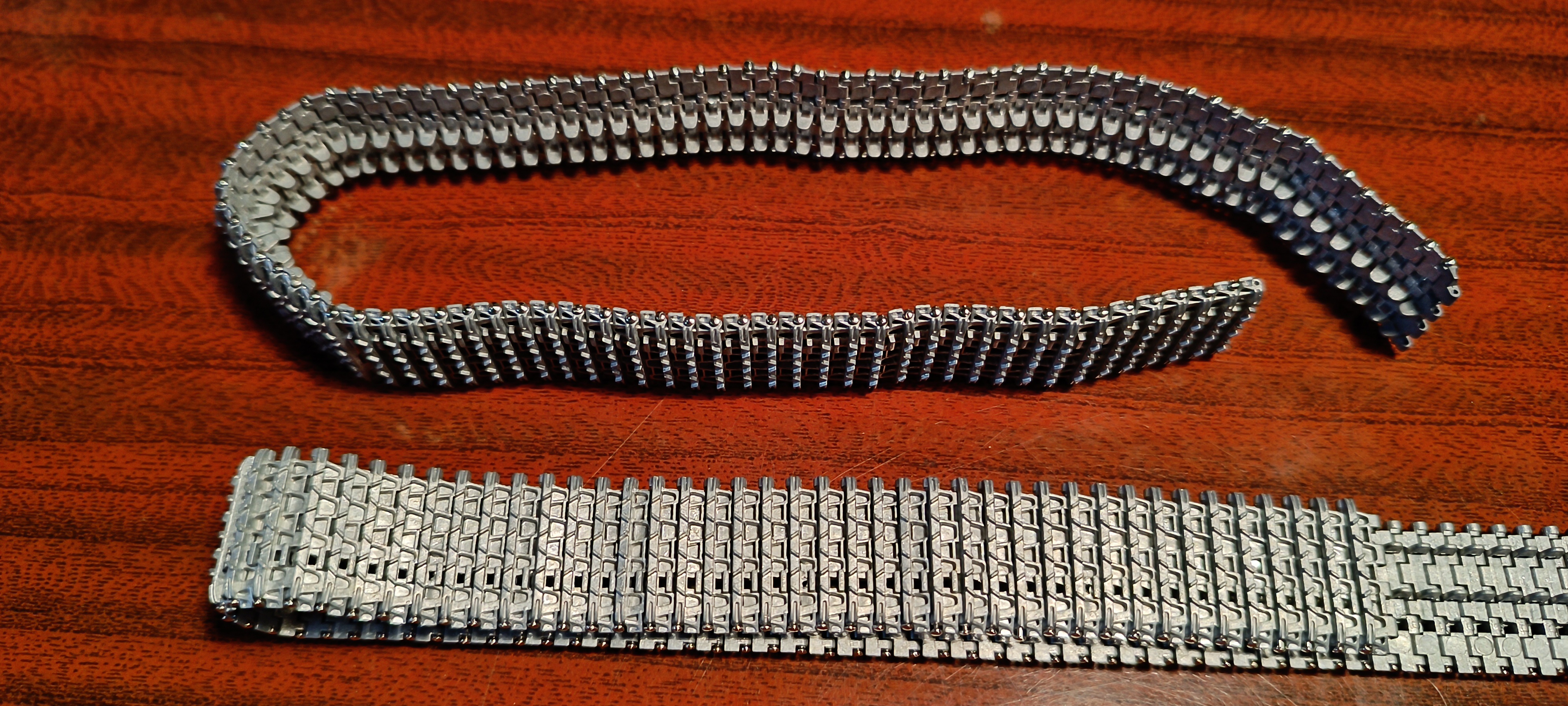 Так точно, разные траки. Прежде чем сделать такую вольность, проконсультировался с человеком занимающимся техникой союзников. Ну и по задумке, машина тыловая, восстановлена тем, что было под рукой. За этот момент легко могу отхватить ссаных тряпок, но сделано всё специально.