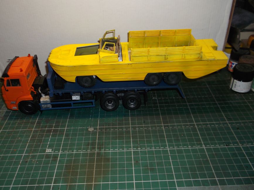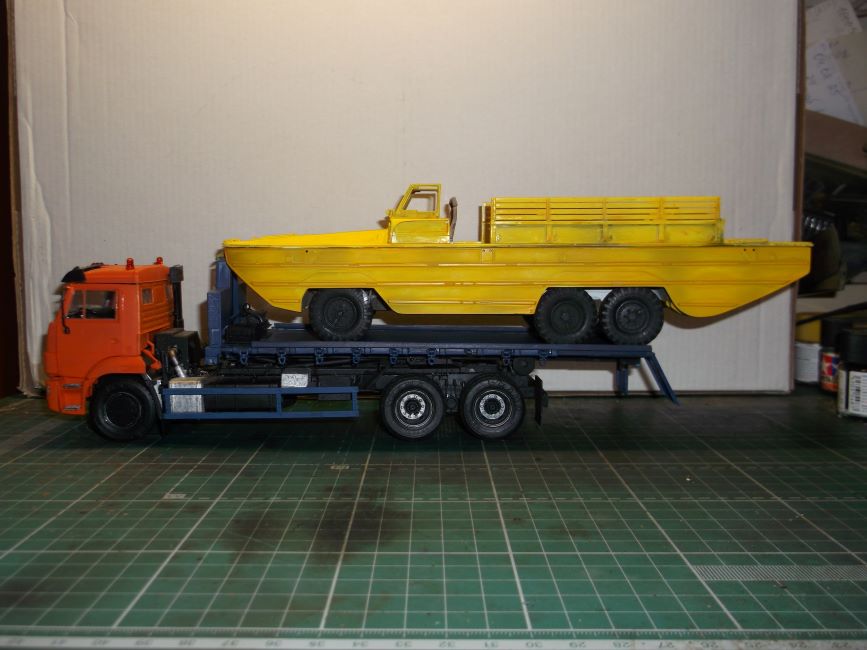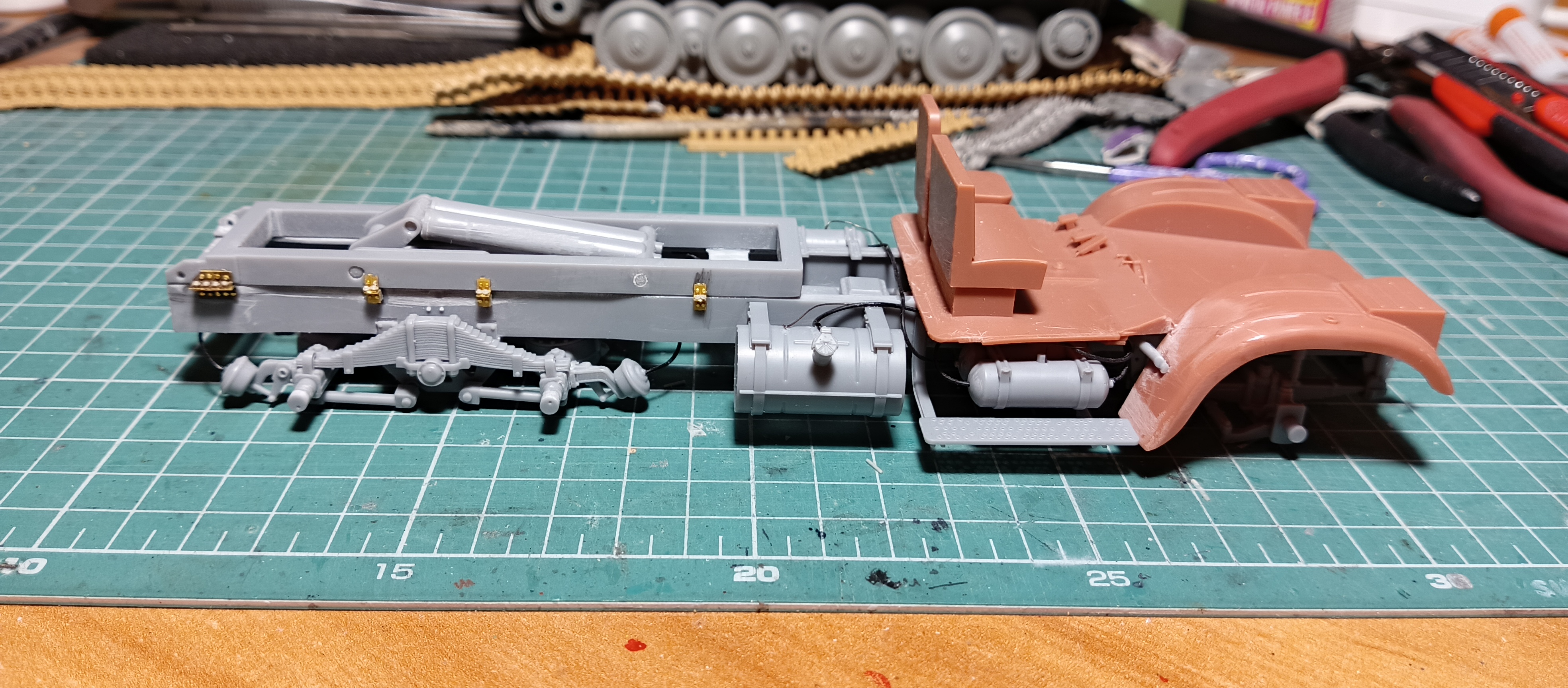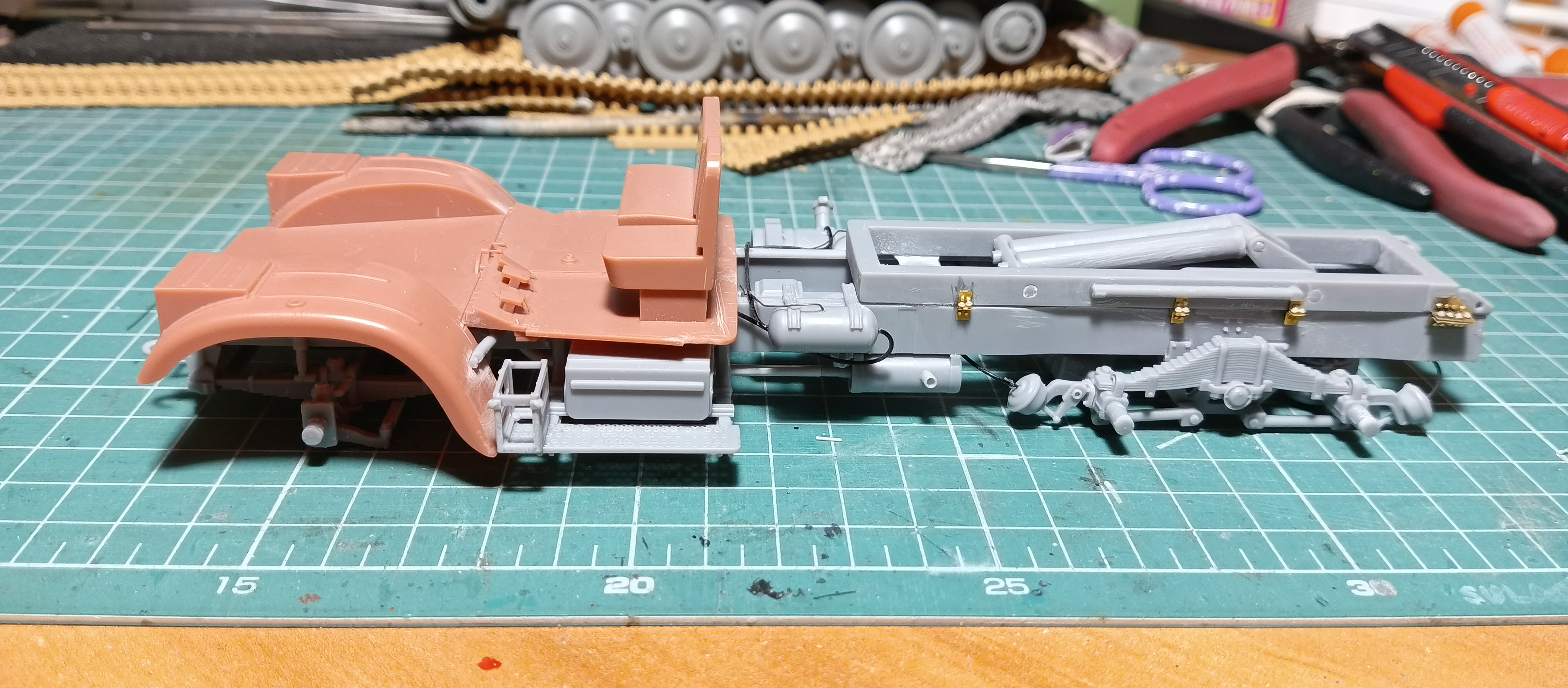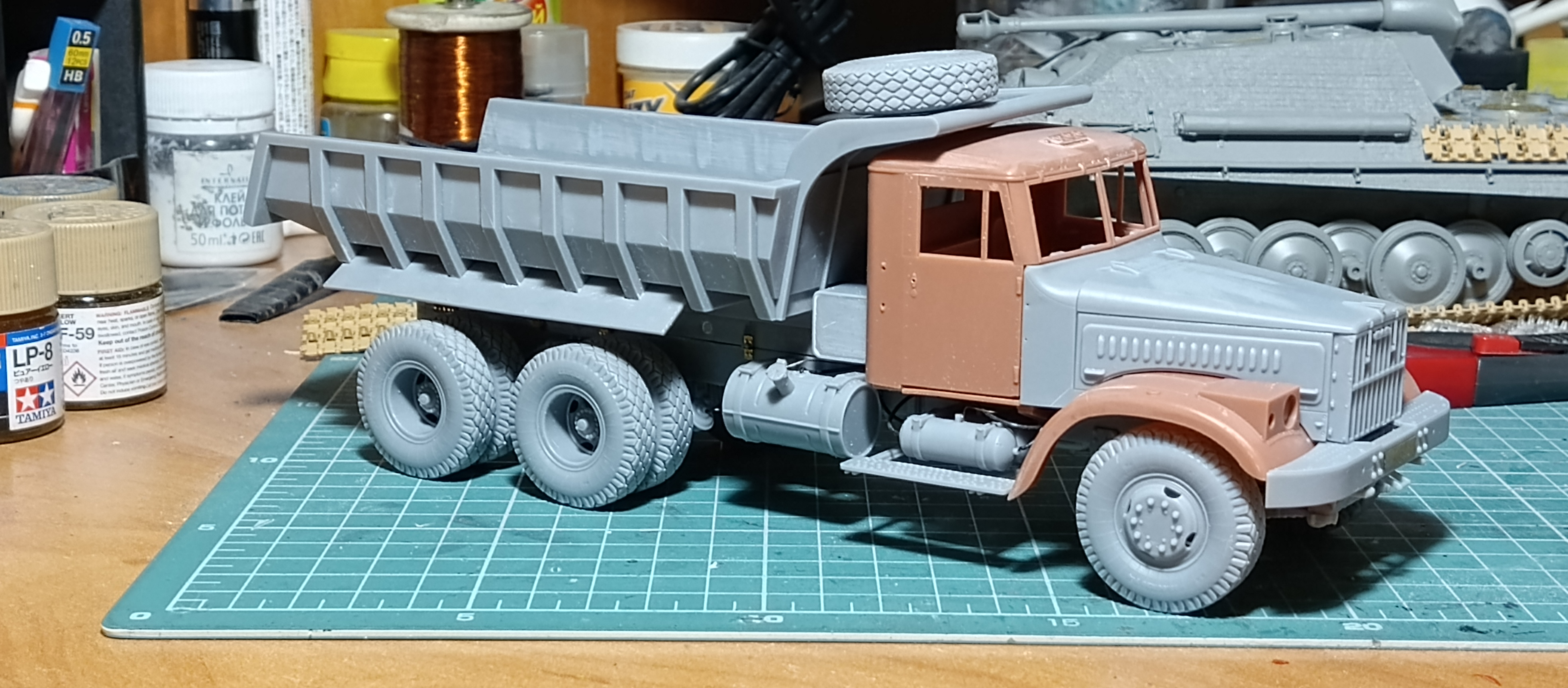 Прогресс по людоеду на сегодня. Пока выводы такие, при офигенном качестве печати, с мелочами, которые делают внешний облик машины, есть проблеммы. Уши крепления рамы кузова к раме, извольте делать сами, все дырочки нужно рассверлить, чтоб штифты пролезли и колëса наделись. Под бампер придëтся делать проставки, чтоб он встал как положено, об этом в инструкции молчок. Так как фото самосвалов с двумя баками ничтожно мало, пришлось колхозить систему выпуска