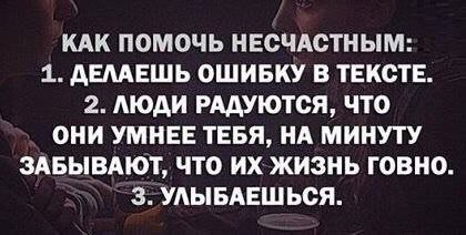 Вот не понимаю людей, которые считают себя умнее других, но продолжают общаться с плебеями. В чём фишка?! Желание быть умнее других и тыкать это в глаза людям само по себе уже диагноз.