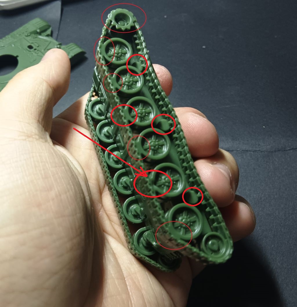 Приливы на стыке катков и гусениц были неудачным решением: боялись, что тонкий выступ пресс-формы может со временем сломаться, и будет нарост пластика. Теперь от этого отказались и делают наружные части катков отдельными деталями/ Но эти наросты и убрать было не сложно. Уж точно проще, чем башню из 9-ти деталей склеивать, шпаклевать и стыки зачищать потом.Бунша И. В.