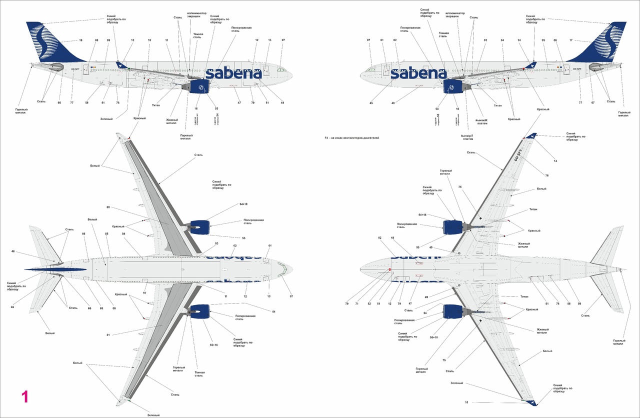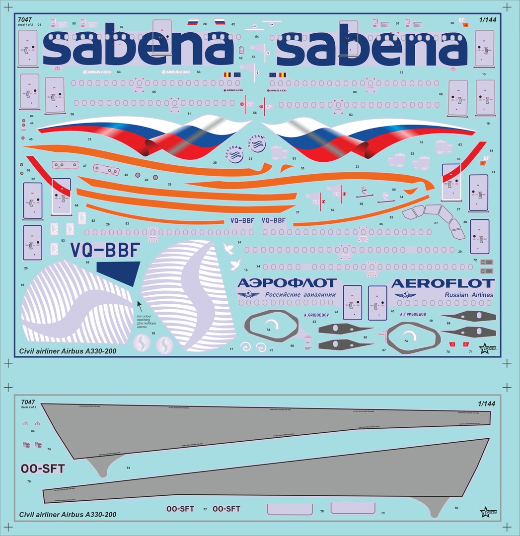 Коробка, тестовая сборка, декаль и схемы окраски для Airbus A330-200 в 144-м масштабе. В наборе будут декали на машины в ливреях Аэрофлот и Sabena