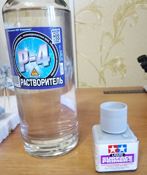 Столкнулся с этим вопросом. Исходные данные – аэр не фирменный, китайская пародия на Jas; Грунт Тамия серый жидкий. Без разбавления аэр не продувает. Фирменный растворитель за 650 р/250 мл. не покупаю по двум причинам – дороговато, и в нашем городе его нет - либо ехать в Краснодар, либо доставка – а это ещё рублей 250. Поэтому решение однозначное – искать варианты. Читал, что можно растворить ацетоном – не пошло. Тиккуриловский уайт-спирит тоже в комки свернул. Короче, пошел в магазин, купил на пробу все, что было. Итог эксперимента – лучше всего подошел Р-4.