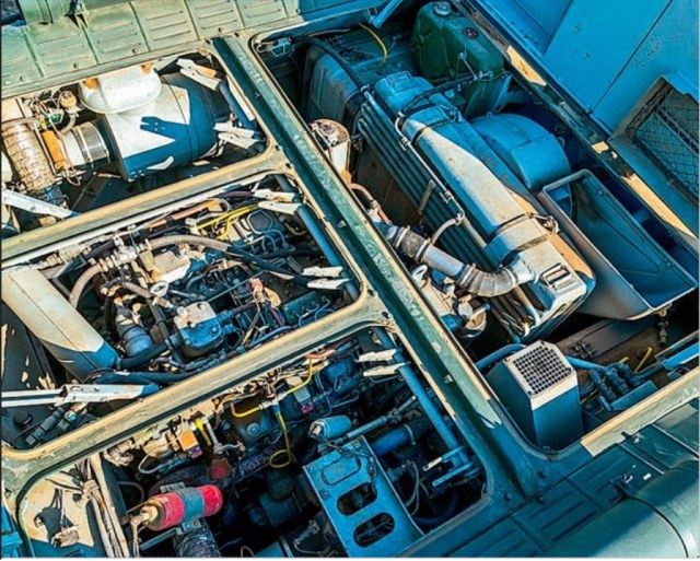 Бытует мнение, что внутри машина белая... это заблуждение, машину внутри окрашивают светлым серым, очень светлым. Почему? Все просто, даже матовый белый при освещении бликует, а это нехорошо. Люки зашнуровывают /верхние/ крепя обивку. Обычно светло серая. встречалась и темно серая, были желания приторочить подбой как на тигре в камуфляжном исполнении, но вроде не прижилось. Люки моторного как и сам отсек идентично как и в боевом в светлом исполнении. Машины в зависимости от заказчика могут быть просто в защитном. Принятое "КАМО" для России идет только для наших . Верхняя створка бортового люка подвой крепится болтами.. Хорошо видно на фото
