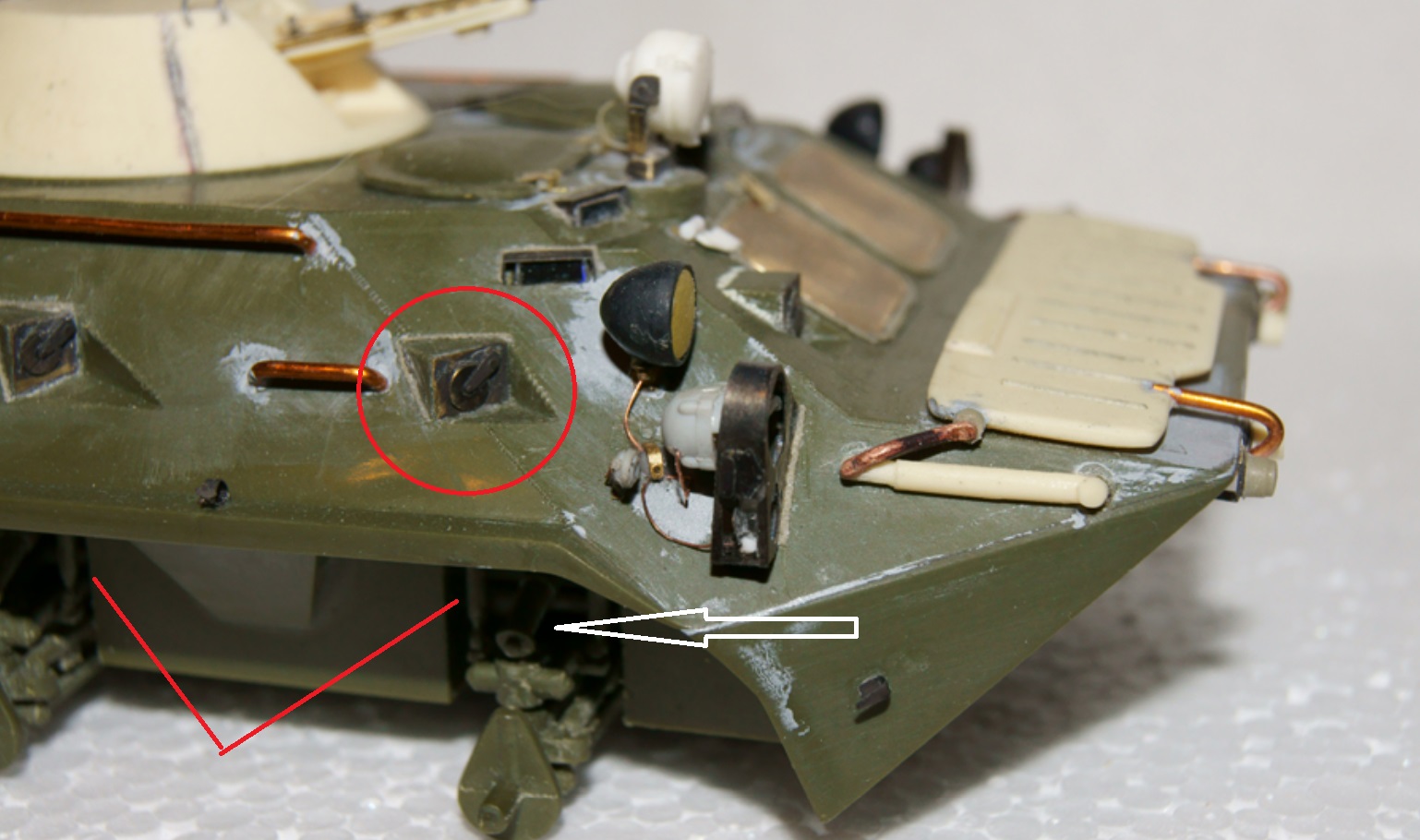 Боезапас на броне....?! Дело рискованное. Где то читал что в Афгане и за речкой часто забивали ящики землей. щебенкой и как дополнительную защиту крепили на броню. Если брать от "Звезды" то там полный полет фантазии ребят из поднебесной. Низ корпуса даже не по мотивам., а по одним им известным источникам. Геометрия всего корпуса /верх и низ / порой не пропорциональна. Базовые размеры гуляют.
