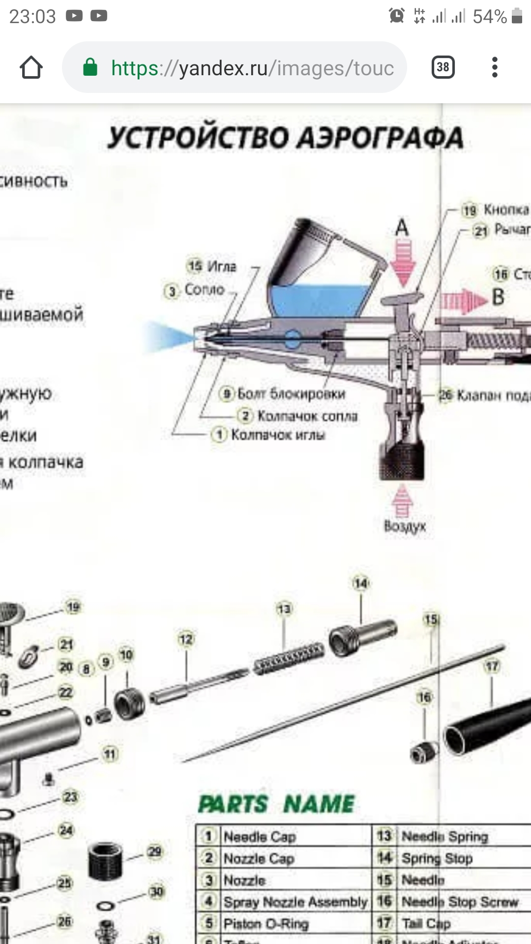Кстати это невозможно, поскольку воздух может попасть в бачек только через сопло а оно немного торчит из корпуса дифузора, краска же выходит из сопла посредством тяги создаваемой внутри дифузора путем подачи воздуха по каналу который выходит попериметру шели между корпусом дифузора и сопла. В бачек более как через отверстие в кончике сопла воздух попасть неможет, и как раз получается если эта щель по периметру забита или зажата то и воздух не идет