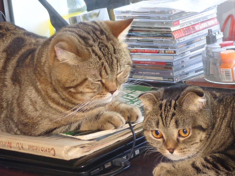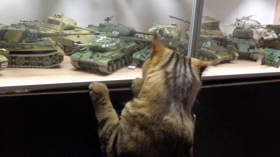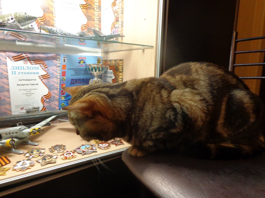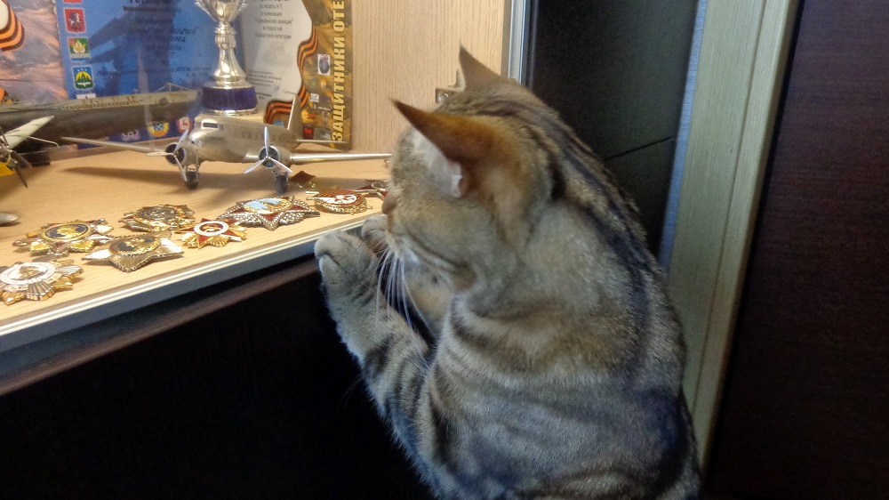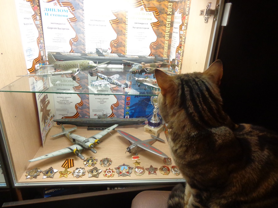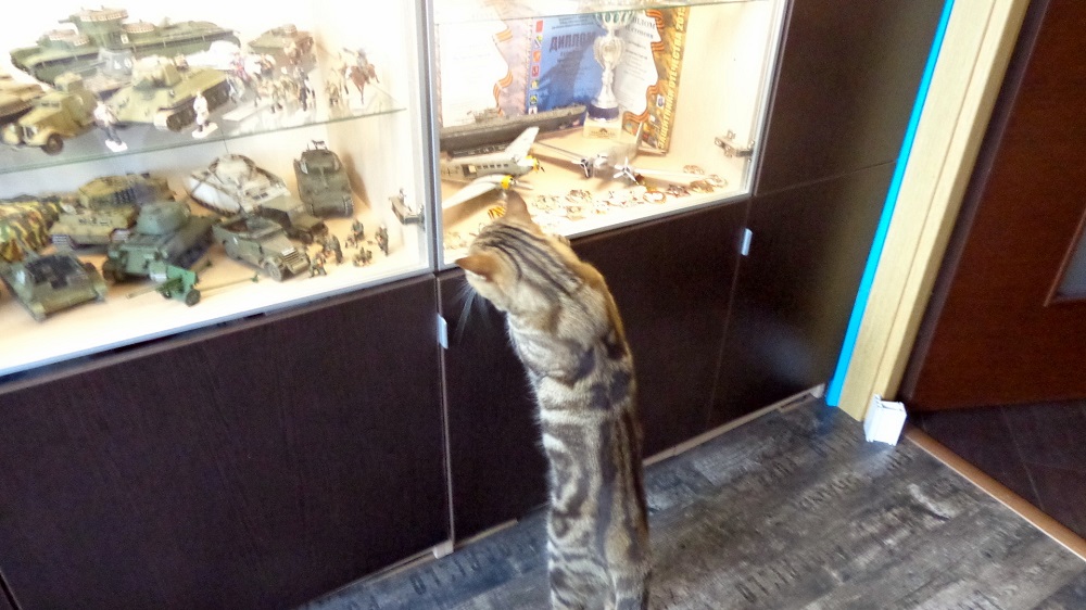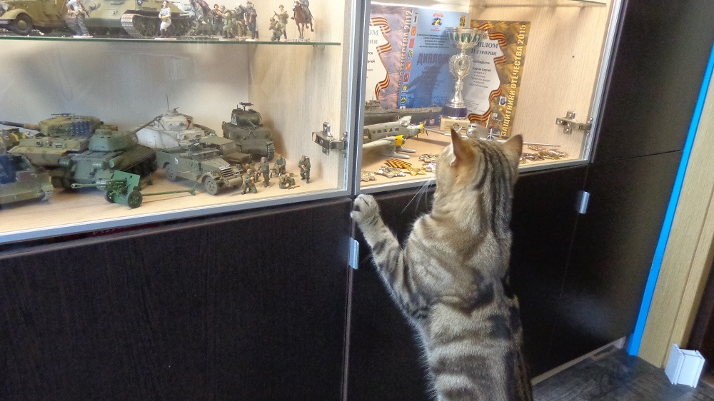 Надо признаться, что и моё увлечение, и домашний музей-коллекция абсолютно не интересуют ни моих домочадцев, ни жену (ну если чуть-чуть). Единственный кто обращает на это всё, какое-то внимание, то это кот. Понятно, что его толкает на это простое кошачье любопытство, но выглядит со стороны забавно.