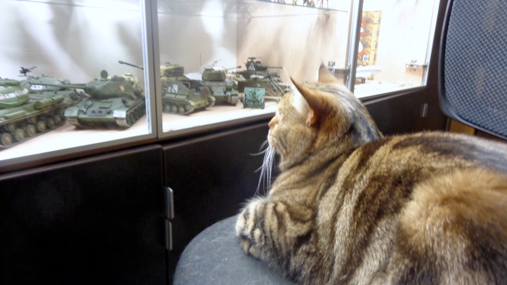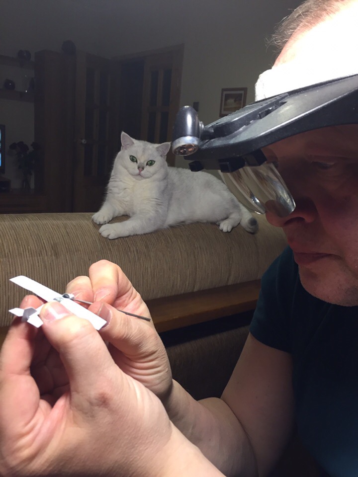 @Сергей Бусаргин,да ничего подобного..на фото где он лежа на кресле смотрит на ис -2 сразу понятно что на матчасть и покраску залип..косяки выискивает..швы и болты считает...мой частенько смотрит как пилю..но фотографироваться не любит..раз надфиль украл...возможно где то за диваном немецкого кошака собирает