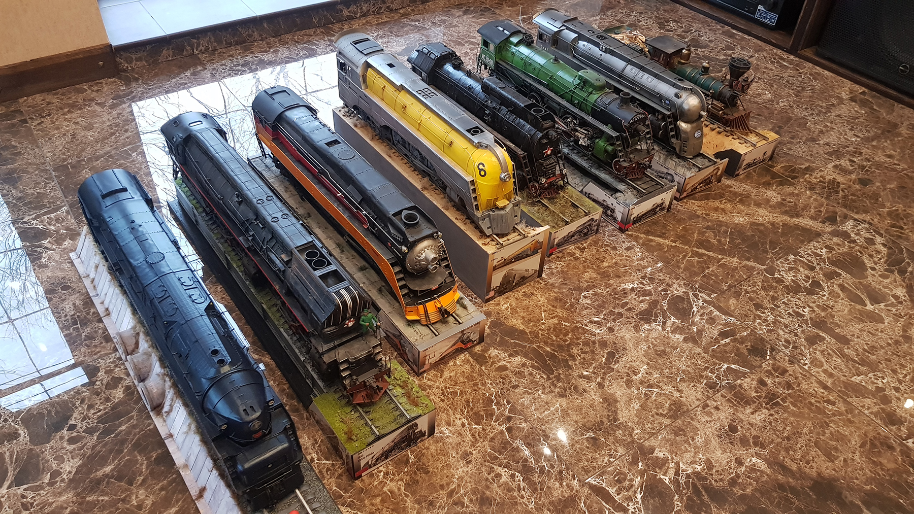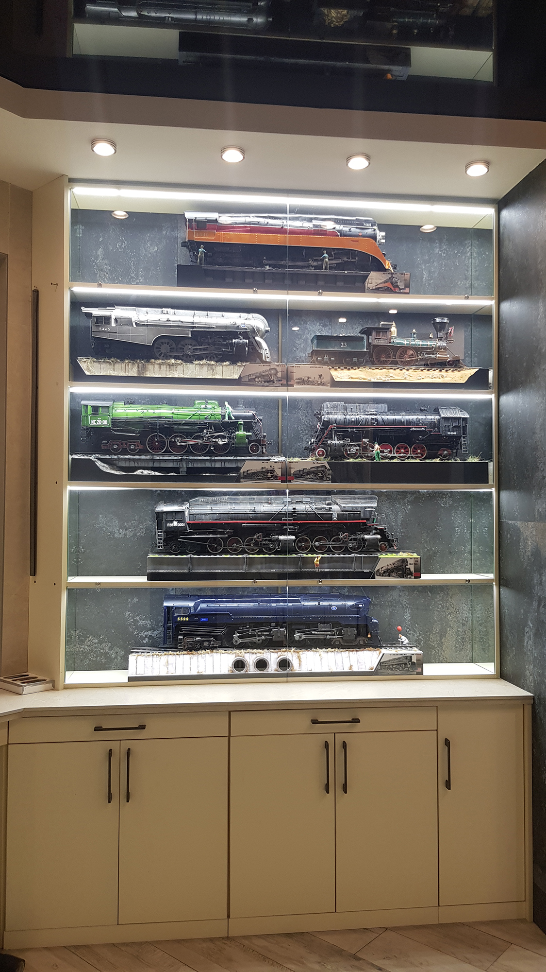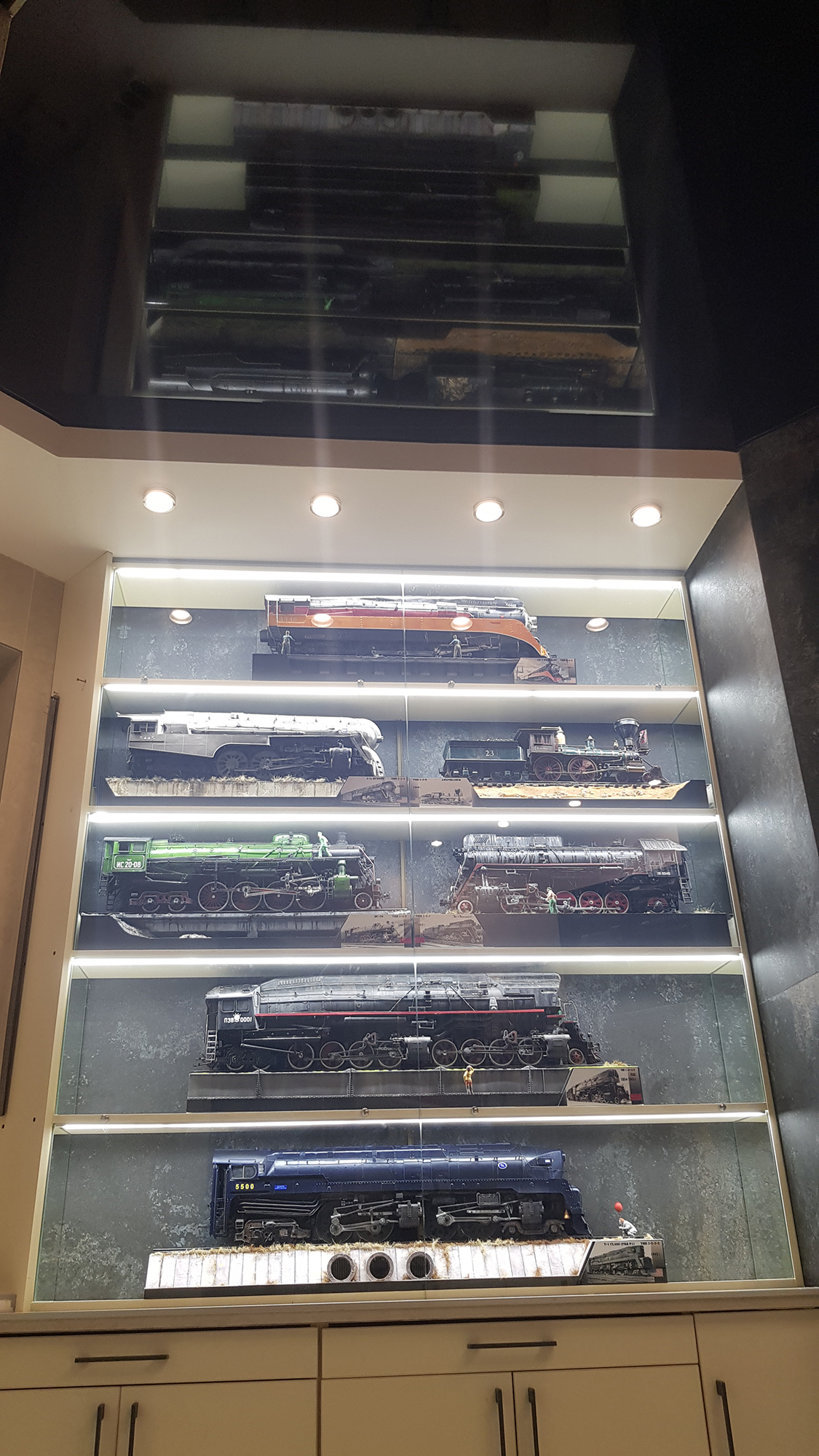 Моя коллекция паровозов хранится в "Кумарной", т.е. мастерской. Комната не большая, но достаточная для работы и комфортного обозрения трудов. Солнечный свет и сквозняки никогда не попадают на модели. В черном глянцевом потолке все это хозяйство шикарно отражается