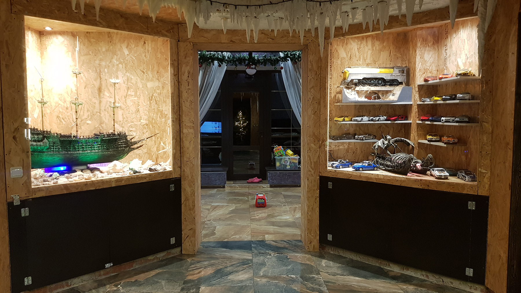 Также, в геометрическом центре дома находится 8-гранный холл. Из него проход во все комнаты дома. Тут размещено 4 ниши. 2 под модели автомобилей и 2 под корабли. Сейчас в состоянии оформления.
