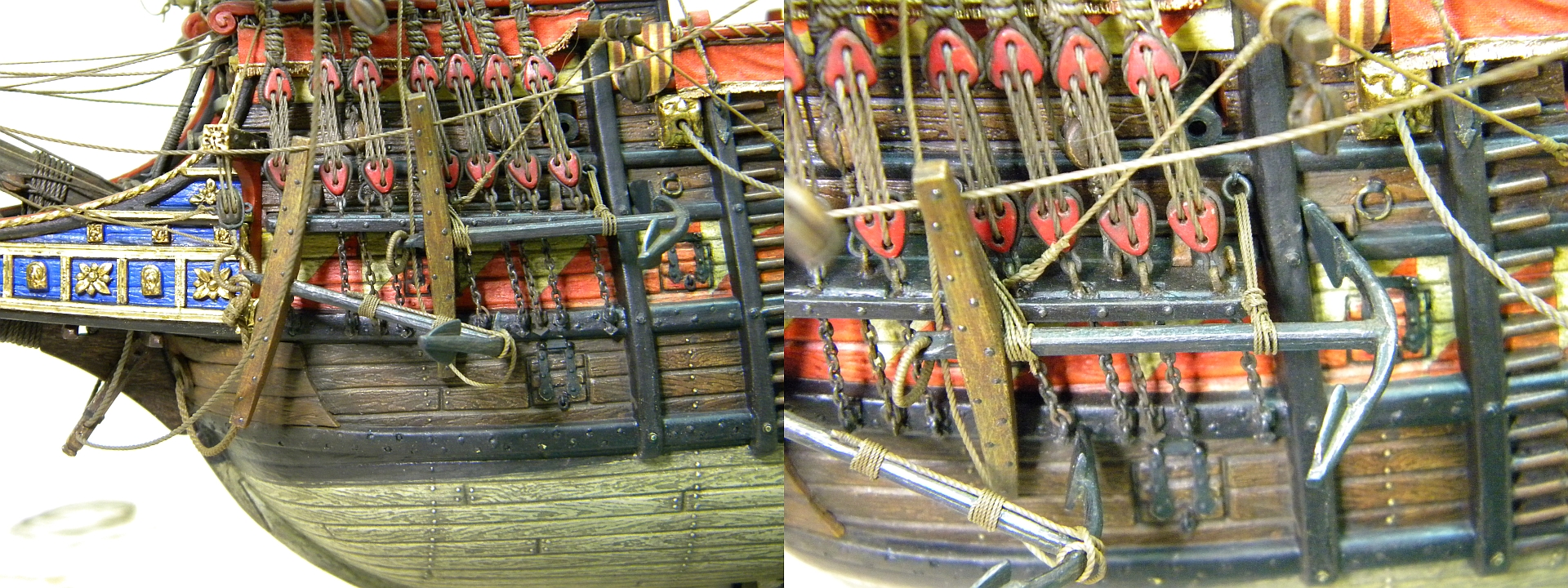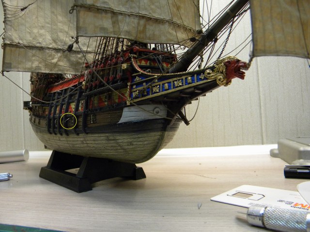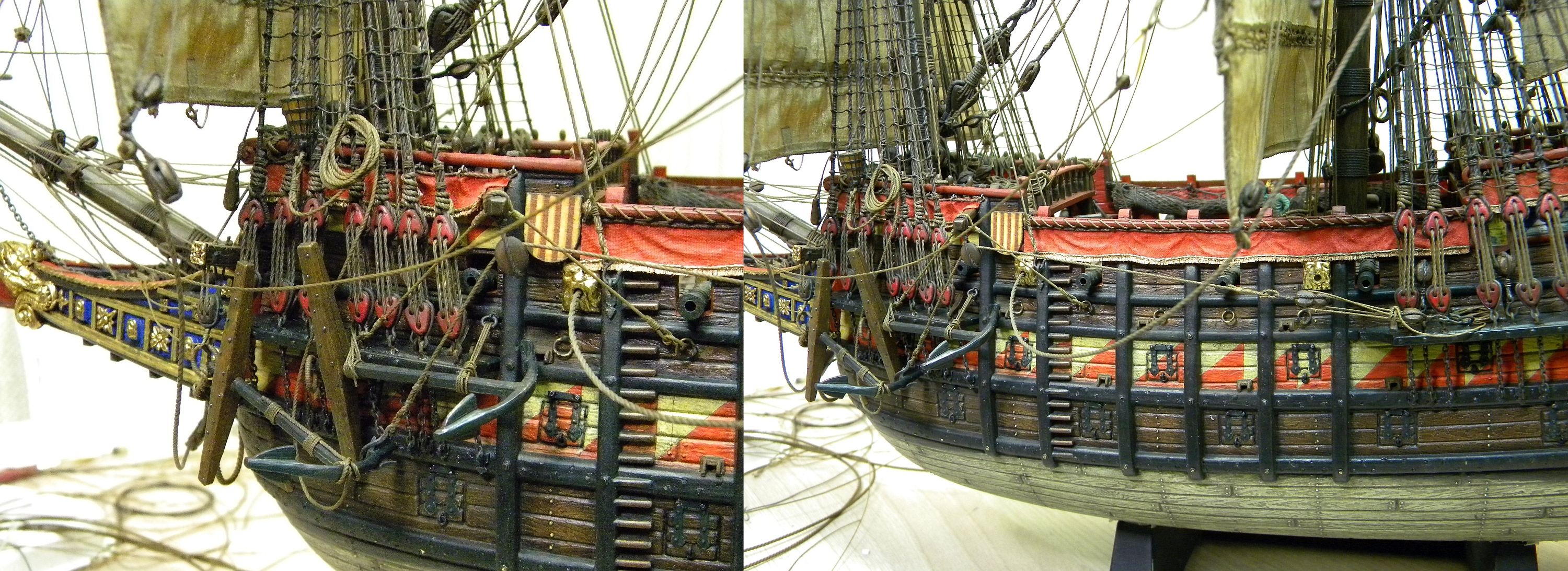"оформил" по новому петли крышек пушечных портов, сделал имитацию с помощью акрилового контура "темное серебро"... убрал имитацию канатов для открытия крышек...будет без канатов