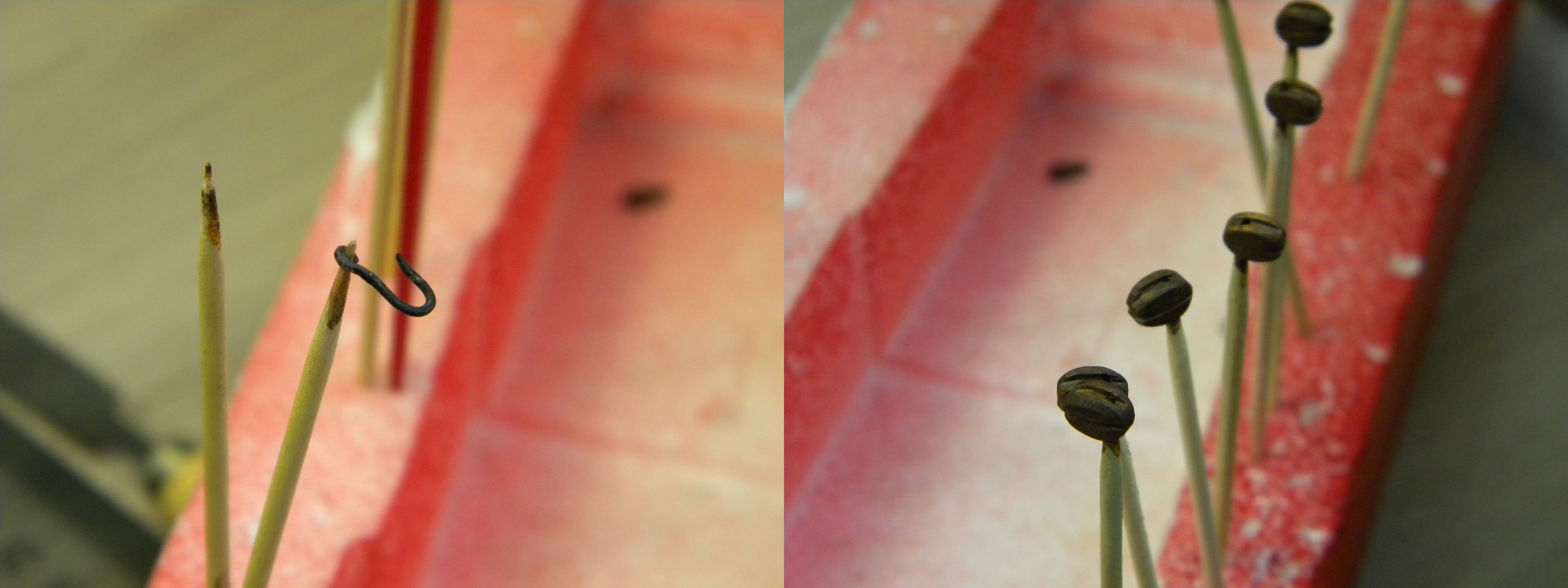Небольшое продолжение с вооружением якорей,начал с левого борта... якоря ставлю на проволоку,что бы как то их зафиксировать в пространстве