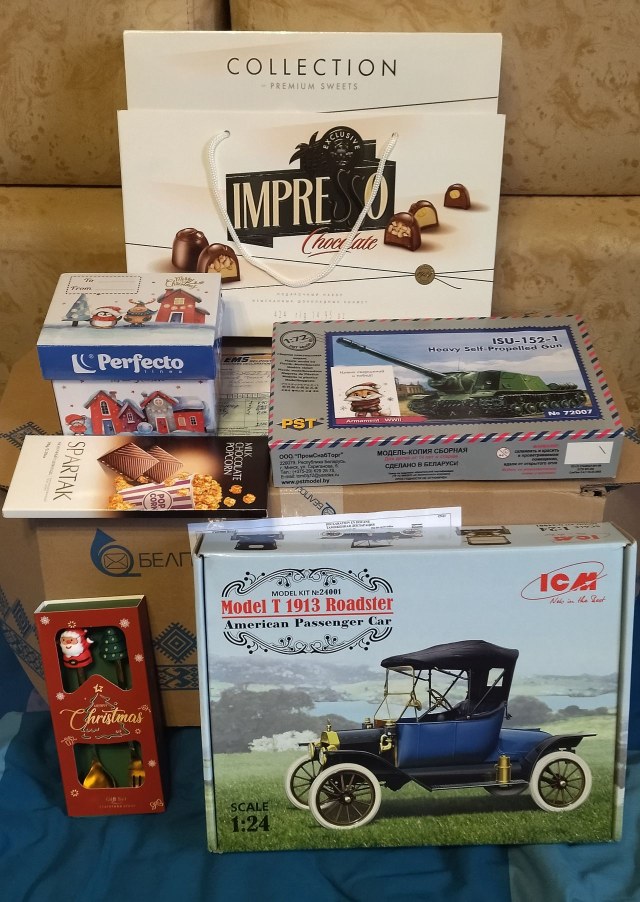 Давеча сходил на почту, чтобы забрать свой новогодний подарок от АДМ Эдуарда из славной Казани. Коробочка большая и увесистая, а внутри настоящее новогоднее настроение: сладости, кофе, чай и модель. Словом, всё то, что греет душу и создаёт новогоднее настроение. Эдуард, огромное спасибо, мне очень приятно