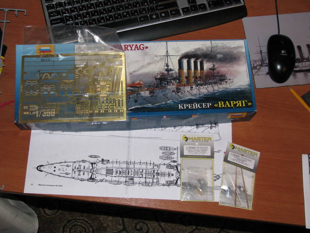 В наличии имеется сам набор, фототравление ВЕМ, точеные стволы и мачты от мастера, в перспективе орудия ЗИП и деревянная палуба. Начал корпус, начал открывать порты и скальпелем порезал пальцы. Так что пока немного обожду. Решил, что нос отрезать не буду, а сделаю по способу, который применял Алексей Лежнев на "Орле", который заключается в вырезке из пластика правильных обводов и наклеивания на существующий форштевень. Потом шпаклевочкой. Маньячить, как на "Славе" не буду, но необходимые переделки будут. Думаю делать крейсер в порт-артурском доке, во время перекраски в боевой цвет. Ну, с Богом.