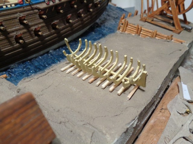 Покрасил, обвязал якоря, бросил их на берегу, концы канатов отправил по назначению - в якорные клюзы. Ну типа якоря вытащили на берег для проведения... каких-то очень нужных работ. Как вытащили? Не знаю, не спрашивайте.