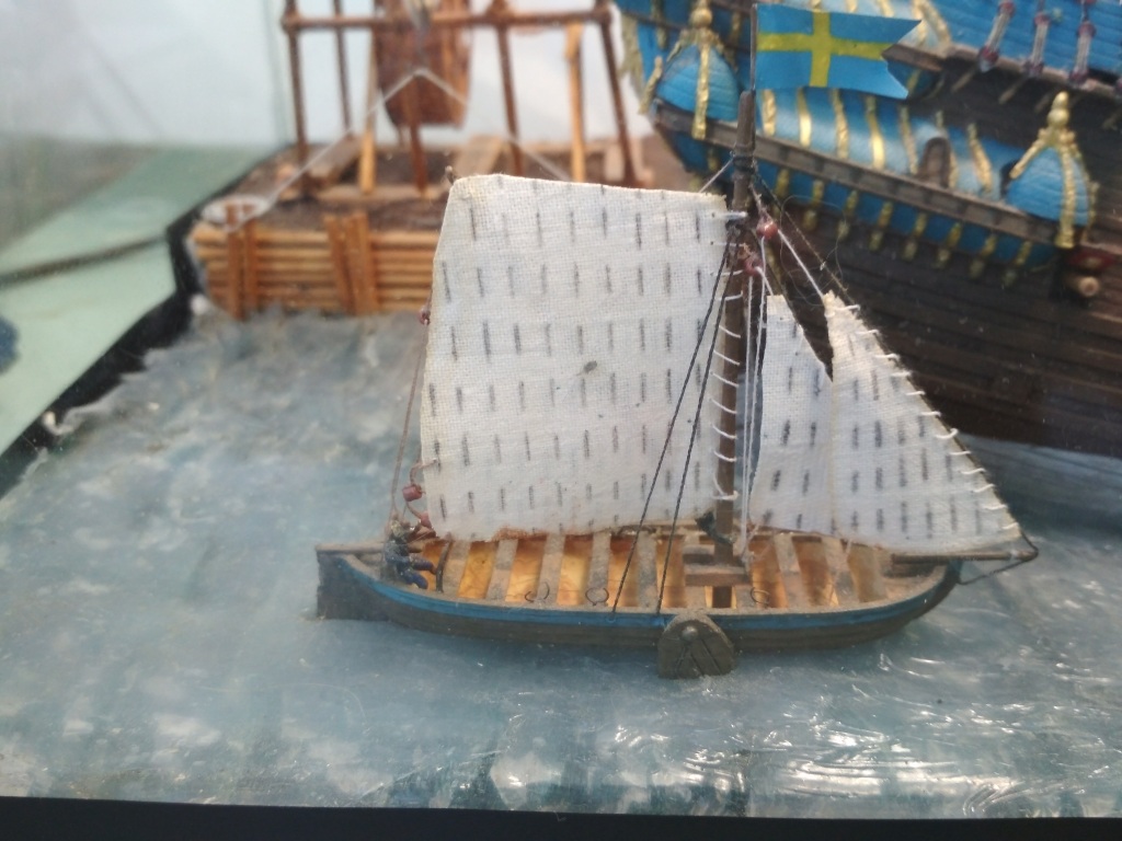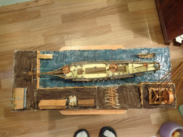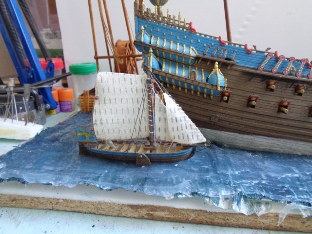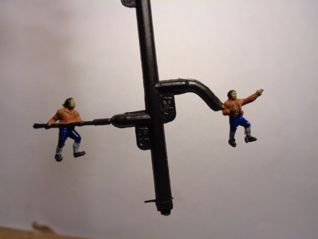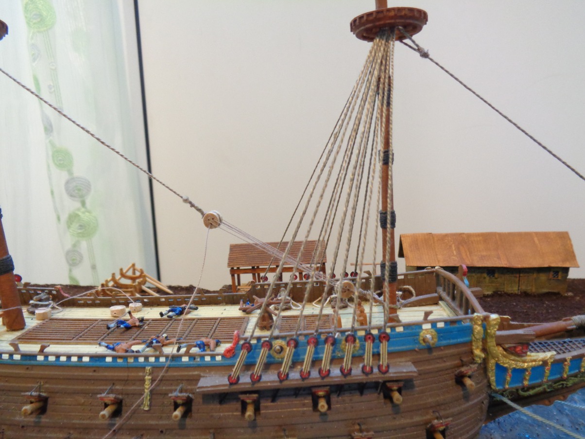 Ну собственно, вот результат ночных рукоблудий. Толщину штага и вант сознательно оставил одинаковую по причине того, что есть мысль после натяжки всего что можно, пройтись по вантам жиденькой масляной краской. Дабы привести цвет в однообразный и по возможности снять лохматость с нитей.