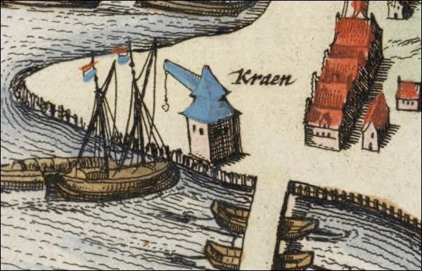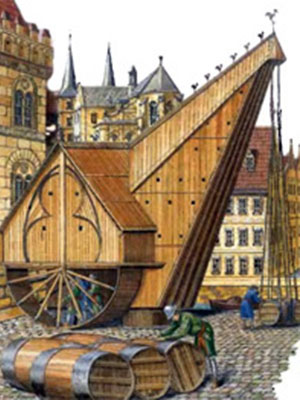 Поискал по кранам. Утверждают, что краны с подъемной лебедкой ввиде большого колеса, в основном, в Англии использовались. Заключенных загоняли в это колесо и они, как белки в нем. В Швеции в ХVII веке (Васа в 1628 г родилась)., именно, такого плана краны были, как на картинке. Но источник неубедительный. Этот же журнал. Там его конструкция в деталях есть.