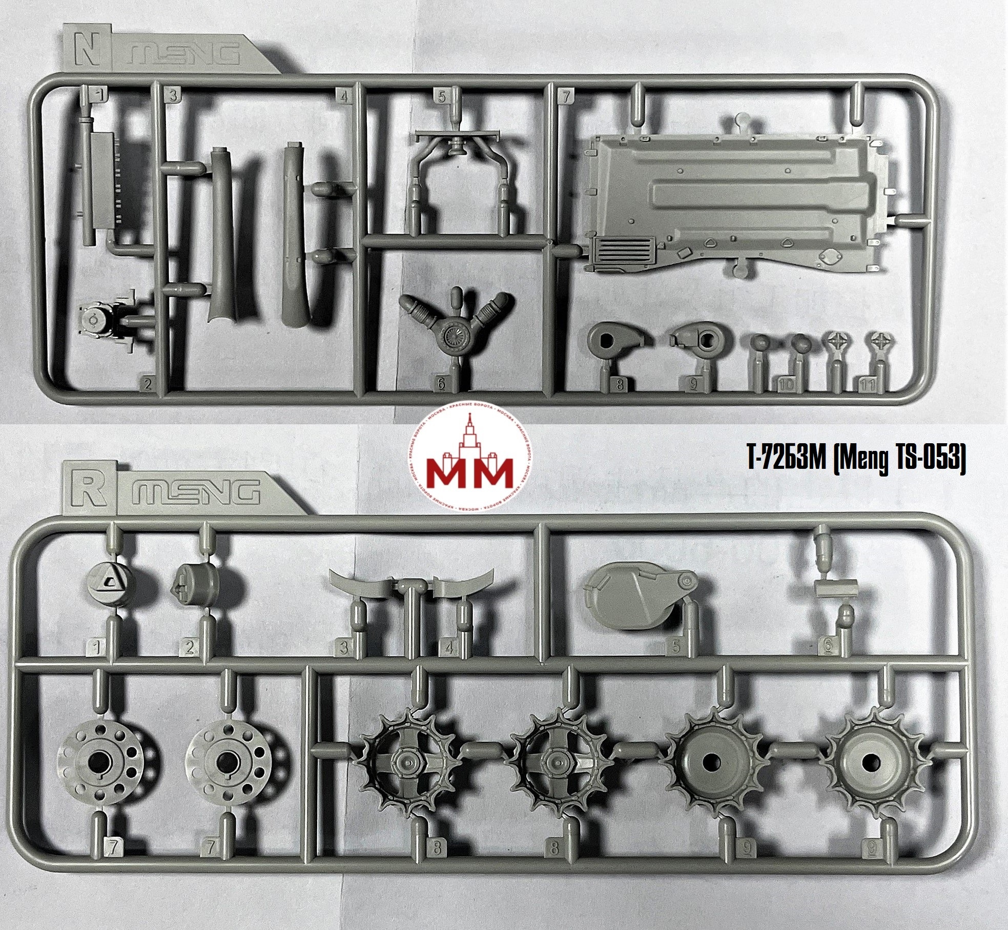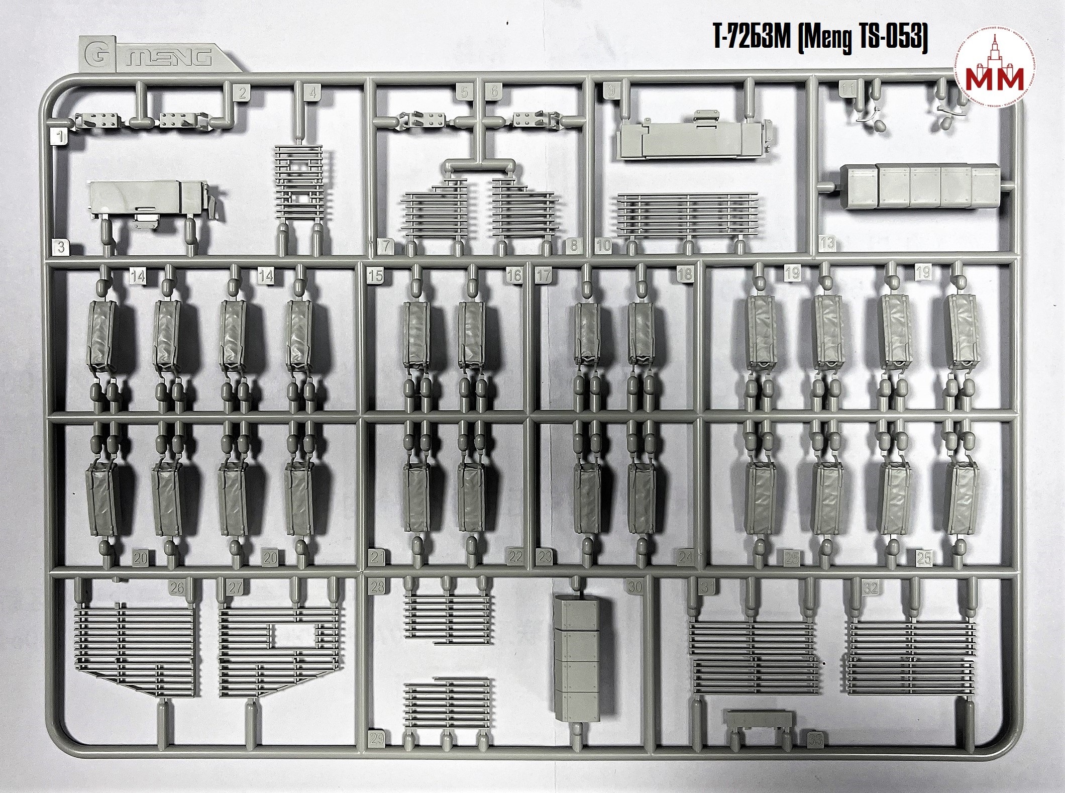 MENG, в очередной раз, совместно со своим партнером «Gur Khan Books» выпустил новую модель - TS-053 1/35 «Российский основной боевой танк Т-72Б3М с тралом KMT-8». Размеры готовой модели: общая длина 279мм, ширина 113мм. Набор включает в себя точное фототравление, металлический трос и три варианта окраски. Предлагаем посмотреть деталировку этого набора.