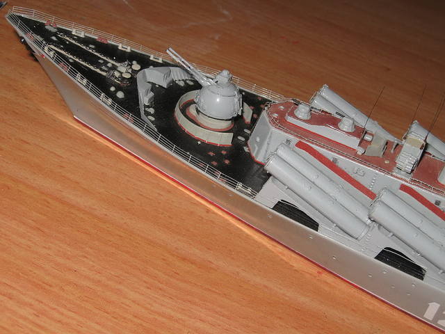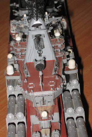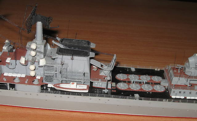 Именно Чабаненко.Я на него даже надстройку/крылья/уже перепилил.Теперь по поводу окрасок: со времен еще спортивных состязаний/класс Ф2-б/ привык отвечать по уставу-"так боцман приказал". А кроме шуток-попадался именно мой вариант раскраски.Под башней барбет в красно-коричневый на металлической палубе,титька"-белая как и все полушария на мачте и прочих местах ,все относящееся к "Осе"-кроме направляющей-зеленое.Найду-выложу.Да,база будет чисто умозрительная,без привязки к конкретике: берега кусочек,пирс длинный бетонный,с одно стороны один борт и два -борт о борт с другой.На пирсе автокран и трейлер с ракетами.Четыре буксира в полуготовом состоянии,куча "резиновых" лодок-теперешнего обязательного оснащения,ну еще там по мелочи.Плавкран наверное.Может быть для равновесия еще ПЛ какую поставлю.Да и Москву еще есть возможность доработать.