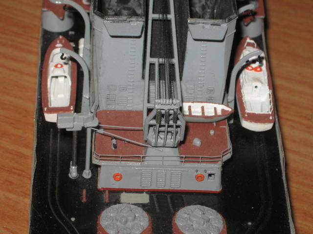 Вот тоже фотик не передает.Я брал черный матовый хумброл и чуть чуть серебрянки/попалась баночка очень мелкого помола/ его же выпуска.Верхние палубы красно-коричневая /очень капризная /краска для защиты от ржавчины.Узкие полосы вдоль ракетных контейнеров выполнены из бумажных наклеек,покрашенных этой же краской.А сейчас я нашел несколько цветных бумаг этого же красно-коричневого цвета.