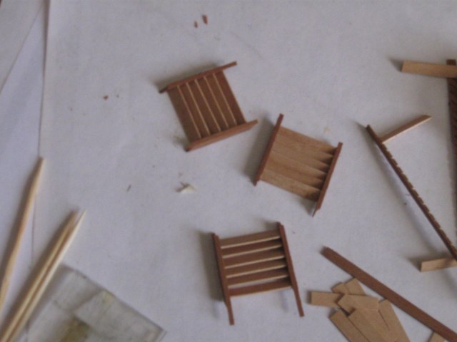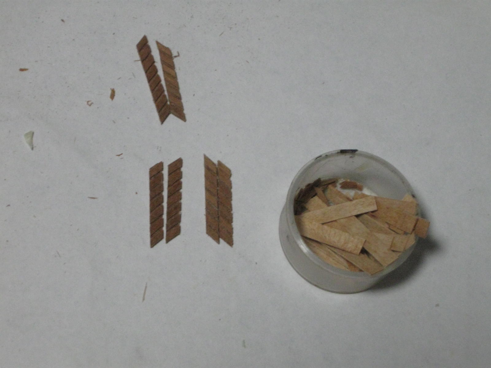 Для примера рассмотрим масштаб 1/30. Ширина доски 4,5мм. Берем массив дерева. Лучше всего клен, но и береза хороша, и светлая груша, яблоня, лимон, и режем из него дощечки толщиной равной ширине доски палубного настила, т.е. эти самые 4,5мм + небольшой припуск на шлифовку. Калибруем в размер, чтобы все были строго одинаковы, а главное, чтобы не было изменений толщины по длине заготовки. Шлифуем, затем покрываем плотным слоем белой краски ПВА с обеих сторон. Это необходимо для того, чтобы закрыть поры на дереве. Высушиваем и тщательно прокрашиваем хорошим плотным слоем черной или темно-коричневой краски. Черная краска не проникнет через слой ПВА и будет на срезе лежать тонкой черной линией. Высушиваем и нарезаем доски толщиной 1,5-2 мм. Мы получаем заготовки с уже черными торцами. Вот теперь только аккуратно набрать палубу, начиная от диаметрально плоскости. Соединение вместе двух черных кромок даст нам идеально ровный аккуратный шов. И что важно в масштабе. Или чуть тоньше, что модель не портит. Под настил надо положить тонкую фанеру. А то шпангоутов-то у нас меньше, "доска" может и прогнуться. Набираем на клею ПВА (Элмерс рулит) в обе стороны равномерно. Не все сразу, высушивая поэтапно. Настелив все, размечаем по длине доски. Все точно так же, как я рассказывал выше. Хотя можно доски и натурально состыковать. Под гвоздики сверлим отверстия и забиваем в них бамбуковые палочки, потому что на настоящей палубе шляпка гвоздя утапливается и закрывается деревянной пробкой. На кленовой или другой светлой палубе бамбук даст хорошую "точку" другого цвета. Но можно загнать и медную/латунную/ проволочку и скусить ее бокорезами по палубе. Медная через некоторое время станет коричневой, а латунная под лаком останется "золотой". Затем все вышкуривается, циклюется - можно настоящей циклей, можно лезвием от японского канцелярского ножа, я циклюю предметным стеклышком от микроскопа. Затем еще раз шлифовка мелкой шкуркой, удаление пыли и покрытие лаком, воском или чем-нибудь другим, что вы захотите. На картинках вы увидите процесс создания палубы в масштабе 1/30.Учтите, что палуба имеет погибь и седловатость. Погибь - это поперечная выпуклость, а седловатость - продольный прогиб между носом и кормой. И если на малых масштабах это можно проделать с тонкой фанеркой, то в более крупных масштабах это выполнимо только набором палубы из досок.![]()
