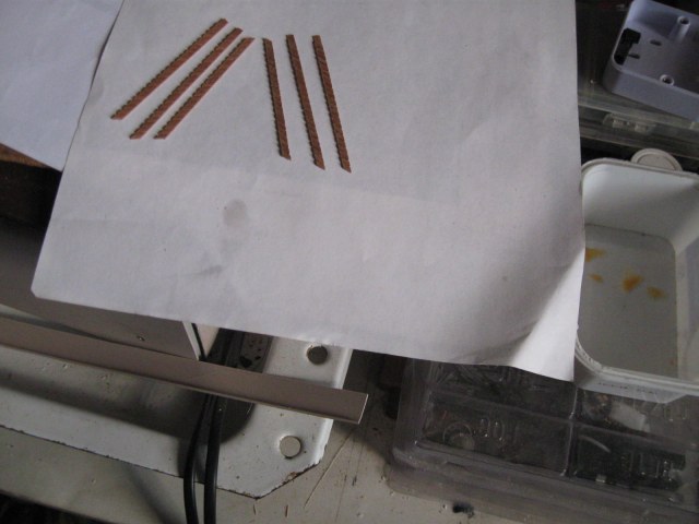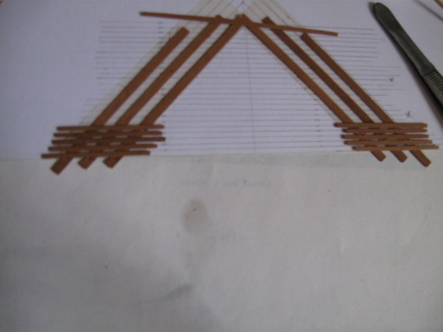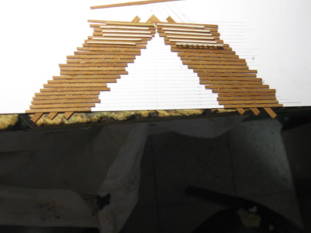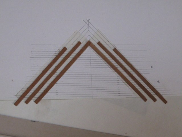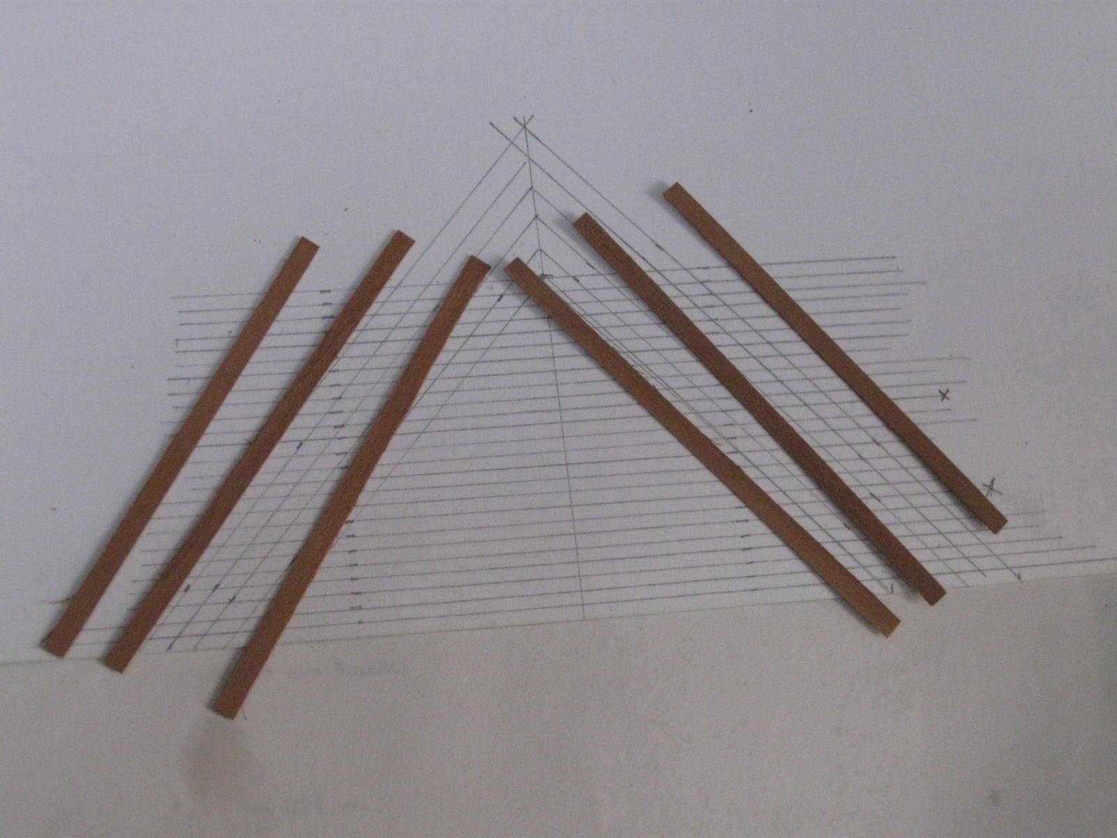 Итак-углы наклона трапов расчерчиваем на бумаге плотной,наклеиваем двухсторонку ,затем нарезаем тетиву нужной ширины и размещаем по разметке. Затем нарезаем подступёнок /высота ступеньки/ и наклеиваем уже на клей на тетивы.Аккуратненько через шаблон.Как видите на примере в работу идут сразу заготовки на две длинных и некоторое количество коротких трапов.Отделяем от разметки и аккуратно обрезаем лишнее.При необходимости наклеиваем ограничительные планки на лицевую сторону тетивы,чтобы спокойно ставить ступени не опасаясь что вылезут вперед.Порядок вклейки виден на снимках.Края,середина ,потом все остальное.Ну остальное хорошо видно и понятно. А что не понятно-прошу спрашивать. Отвечу.