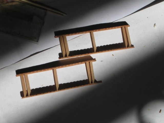 Да, забыл, поперечная разделка настила, так же как и в других случаях. На больших кораблях (броненосцы, крейсера, линкоры) палубный настил "разрезался" поперечными досками. Ну, и при достижении некоторого опыта можно палубу в масштабе 1 /350 выложить отдельными "досками" как это сделано на снимках "Кинг Джорджа". Максим Войтов именно так и выполнял палубу.
