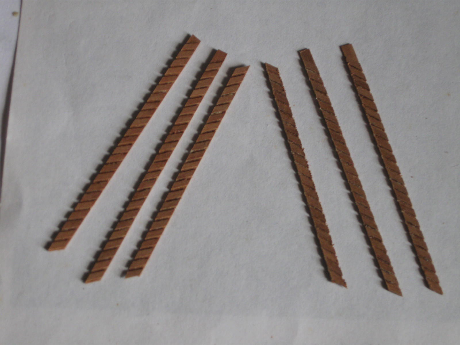 Теперь поговорим о более серьезных методиках. В настиле палубы не только доска играет роль. Шов между досками тоже немаловажный элемент палубы. В натуральной палубе шов заполняется паклей при помощи деревянного клина и колотушки и смолится. Процесс называется конопаткой, и колотушка называется конопаткой, но нам это только для общего развития, а вот сделать грамотный шов на модели - задача немаловажная и не такая простая. Способов немало, каждый изгаляется, как может (это те, кто поопытнее). Не все способы одинаково хороши. Кое-кто даже делает модель с имитацией торчащей из швов пакли. Я не считаю это хорошей идеей. Итак, посчитаем: ширина шва в натуре составляет 1-1,5 см, т.е. 15 мм максимум. Для сотого масштаба это 0,15мм, для 1/50 -0,3мм, ну и т.д. Согласитесь, что это очень немного. Поэтому, изготавливая шов в пятидесятом масштабе, шириной 0,5 мм моделист уже нарушает масштаб. Мало того заполнение шва крашеным тушью ватманом создает проблемы при вышкуривании и циклевании палубы. В наборах настил палубы уже дан в виде "лапши" из шпона того или иного дерева и у моделиста нет выбора. Что можно сделать в этом случае? Только вклеивать полоски черной бумаги, тонкого пластика между досками, клеить этот ватман/пластик к торцу реечки (та еще работенка), или просто карандашом красить торцы каждой реечки. Вот за это я не люблю наборы. Ты должен следовать их направлению. А если "лапша" не масштабна? Потому описываю способ, которым чаще всего пользуюсь для крупных масштабов.