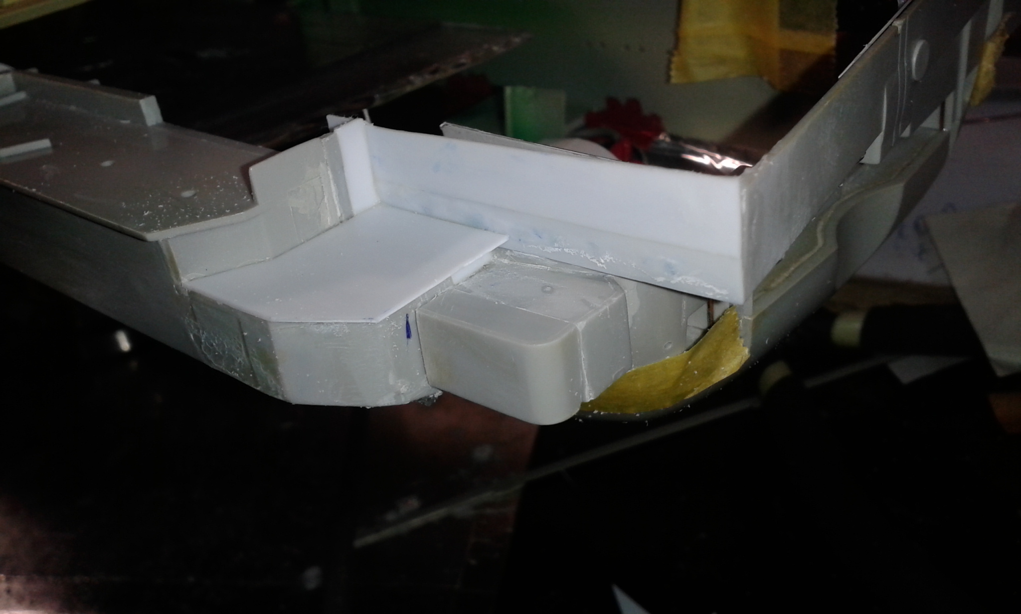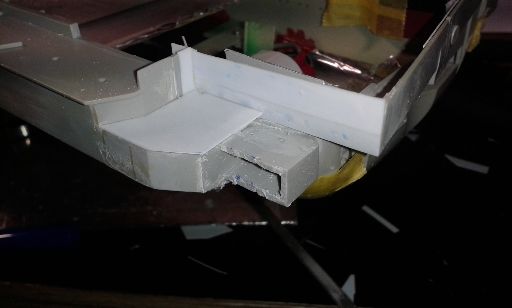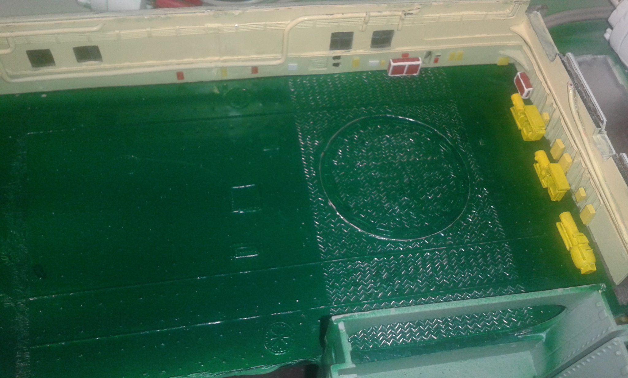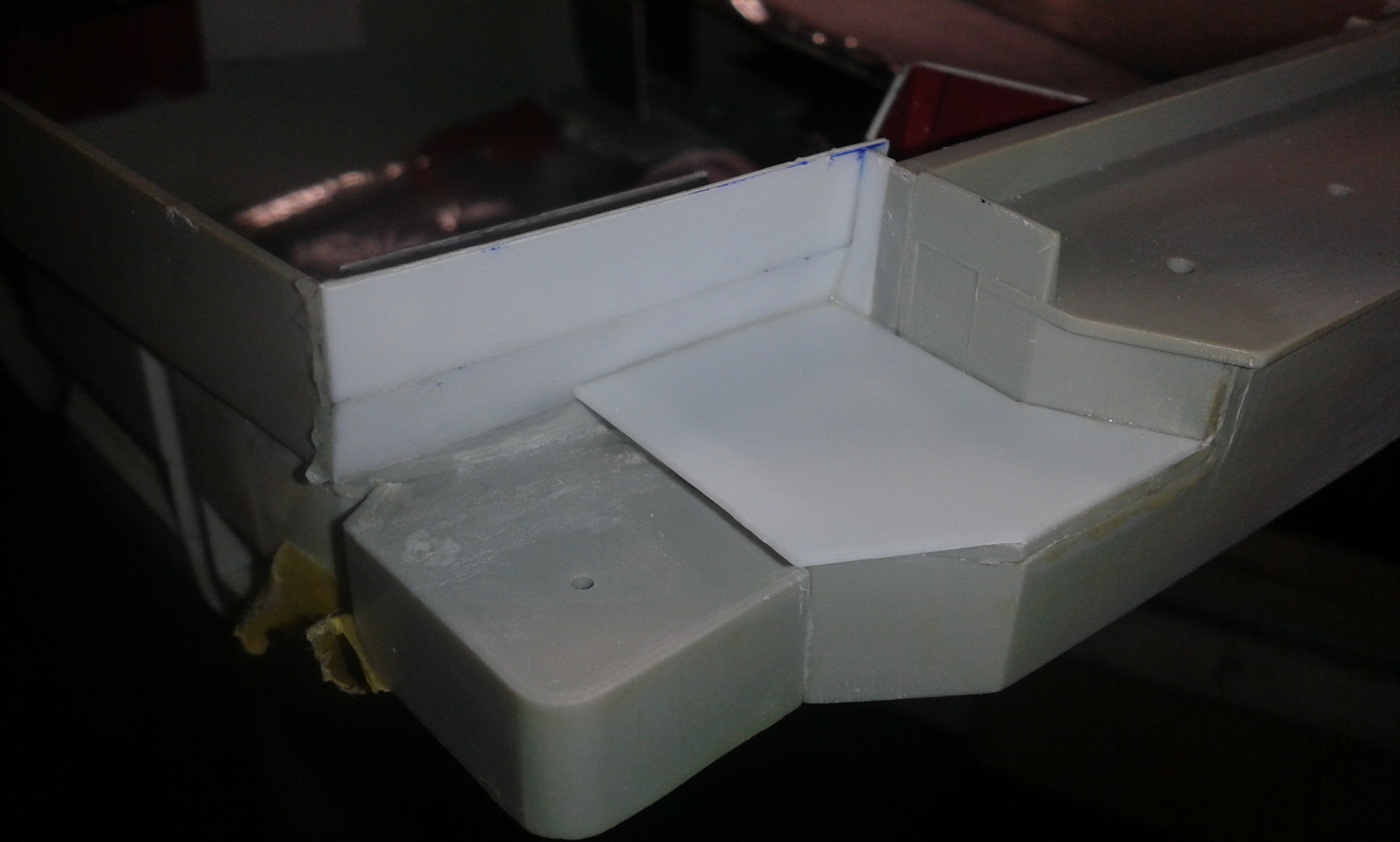 Думал честно говоря все эти отсеки переделать и дело там не только в размере площадки но и в других частях корпуса геометрия неправильная, высота. Перепиливать все это сейчас будет тяжеловато, так как отсеки уже приклеены к корпусу, если до сборки то можно было бы  отделаться малой кровью по сравнению с тем что сейчас нужно будет сделать.