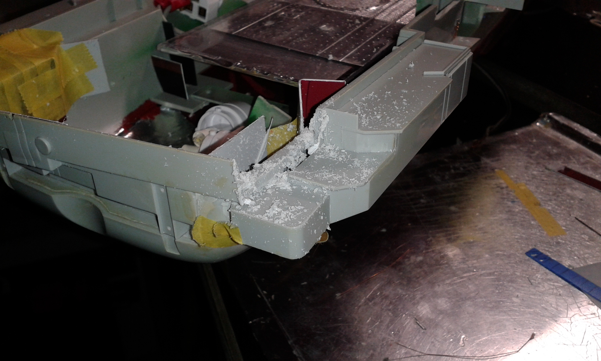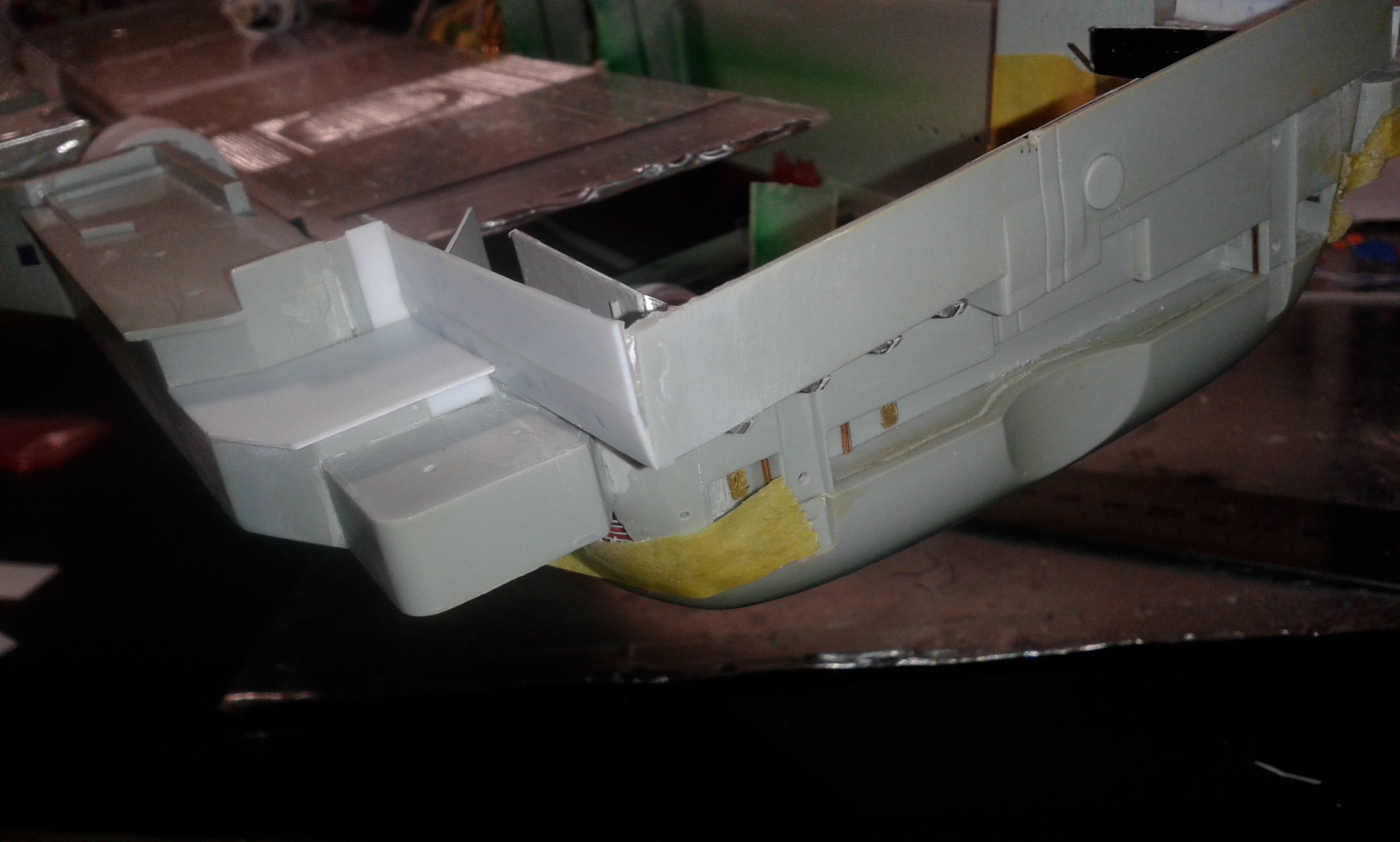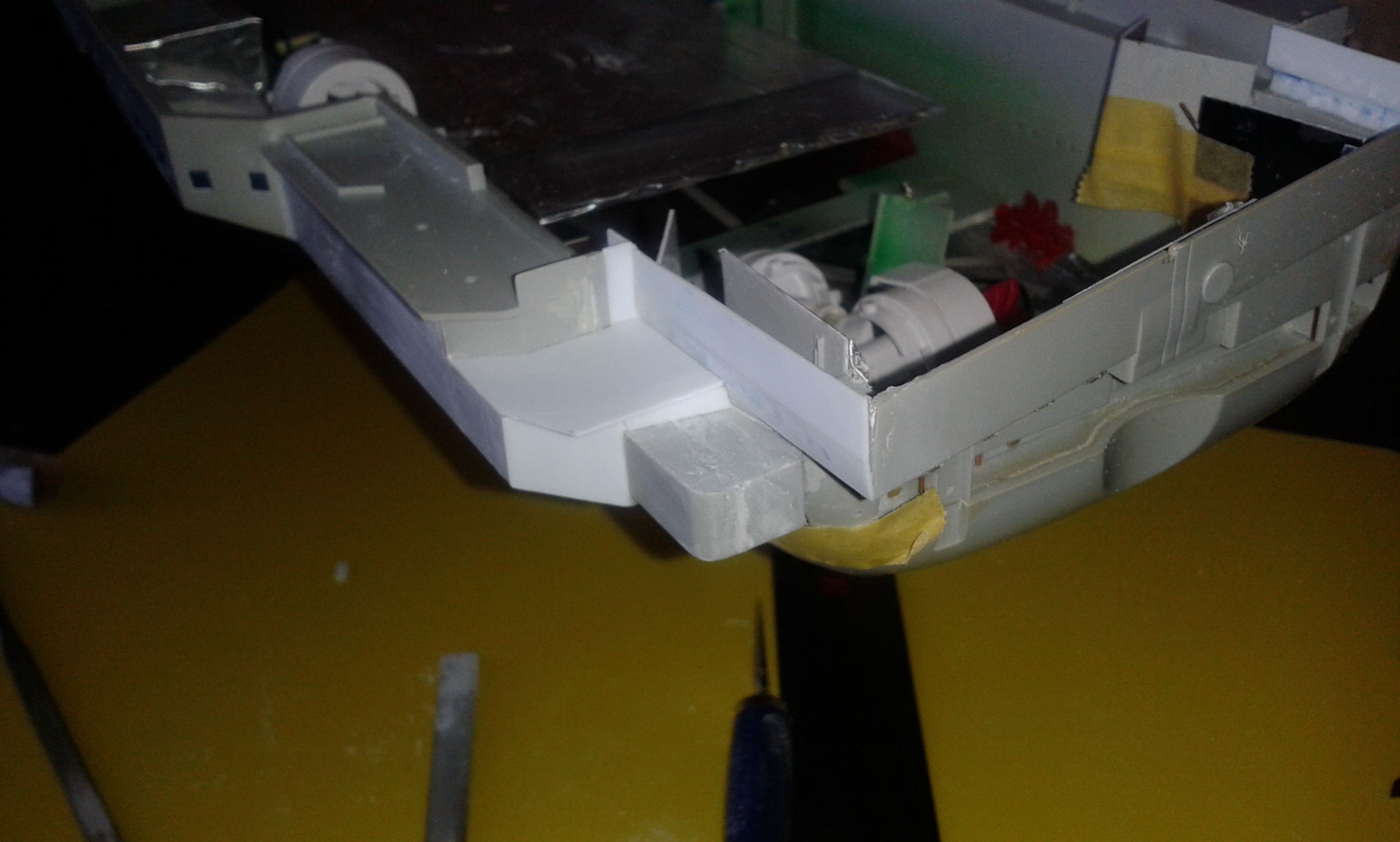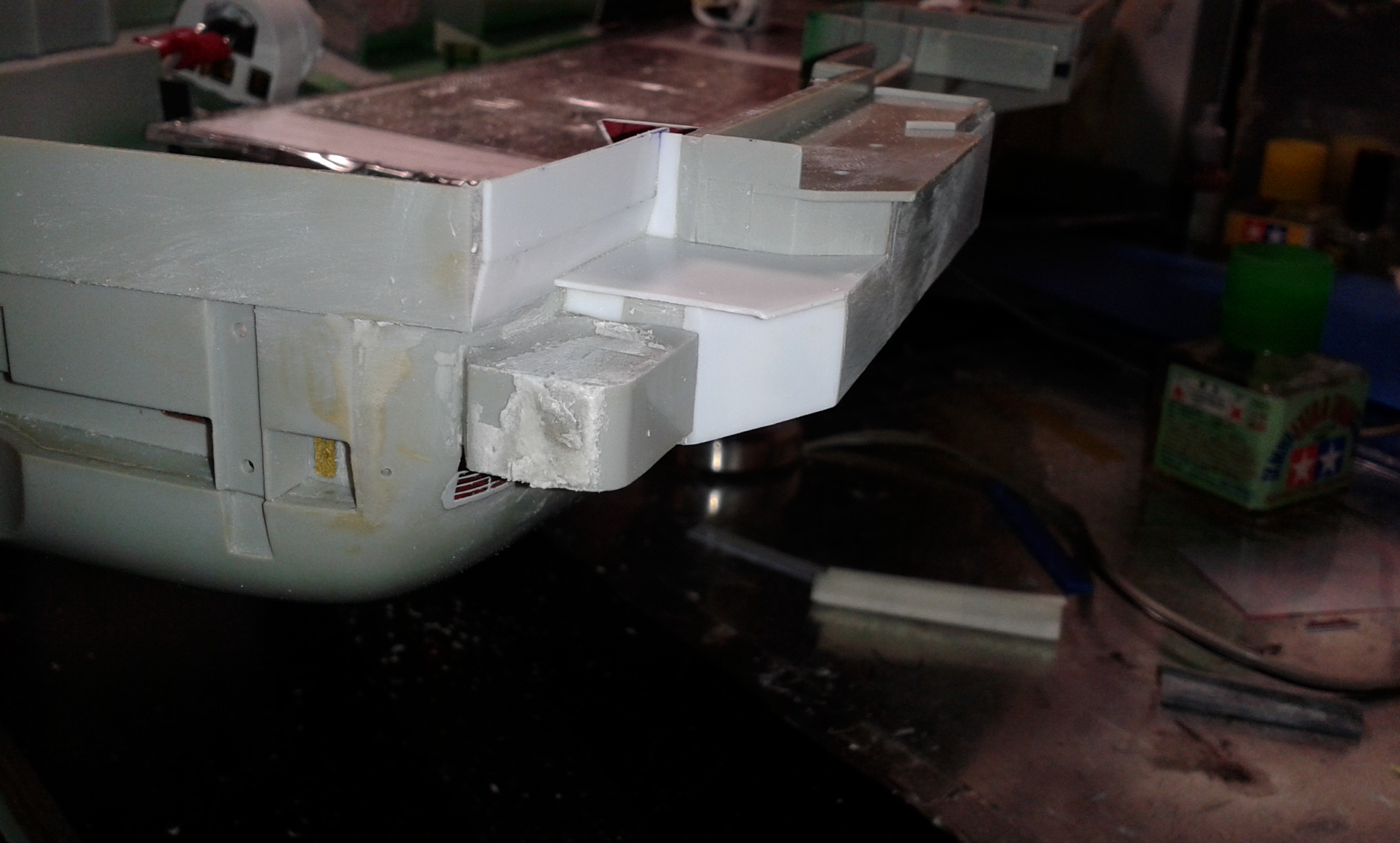 Думал честно говоря все эти отсеки переделать и дело там не только в размере площадки но и в других частях корпуса геометрия неправильная, высота. Перепиливать все это сейчас будет тяжеловато, так как отсеки уже приклеены к корпусу, если до сборки то можно было бы  отделаться малой кровью по сравнению с тем что сейчас нужно будет сделать.