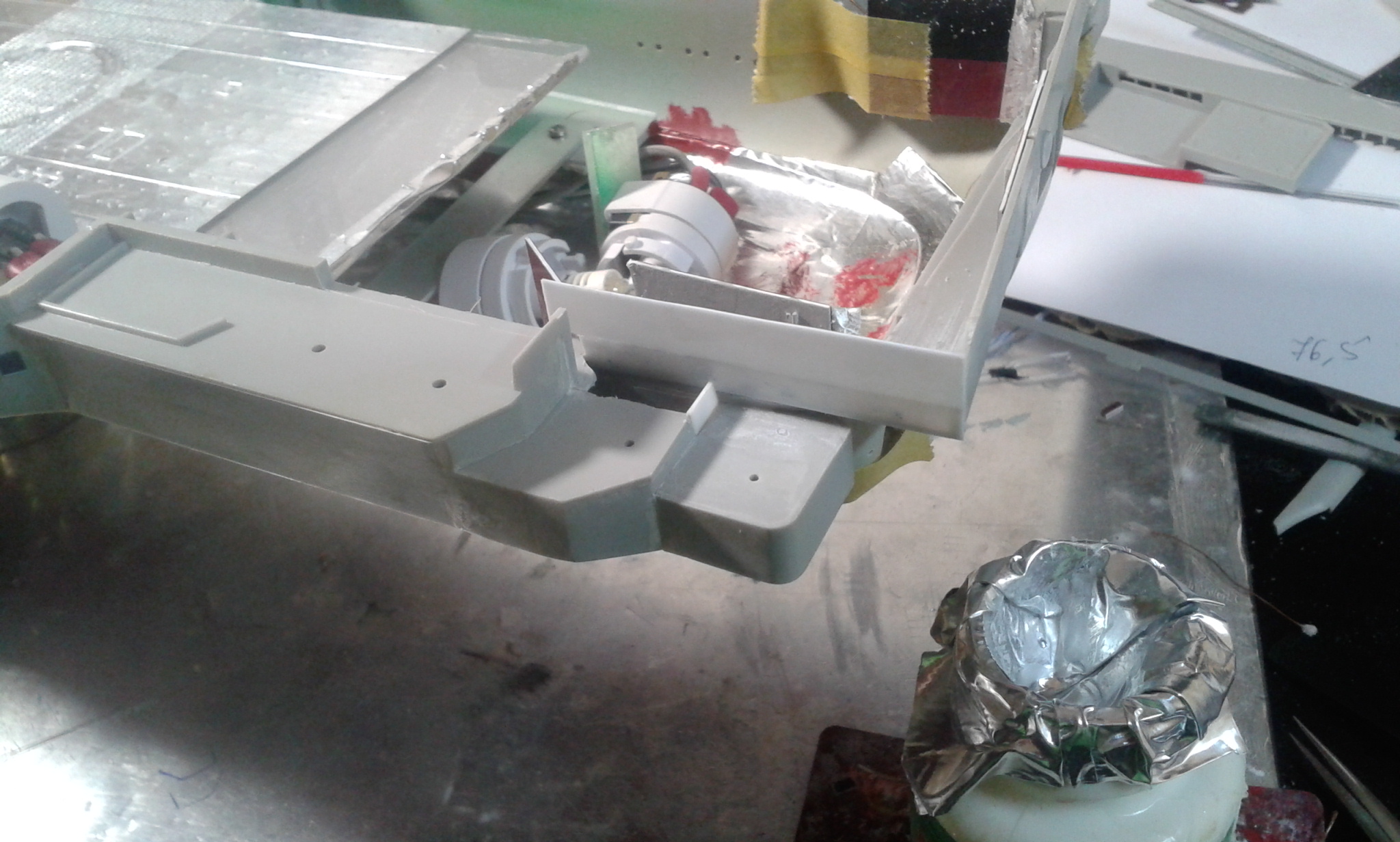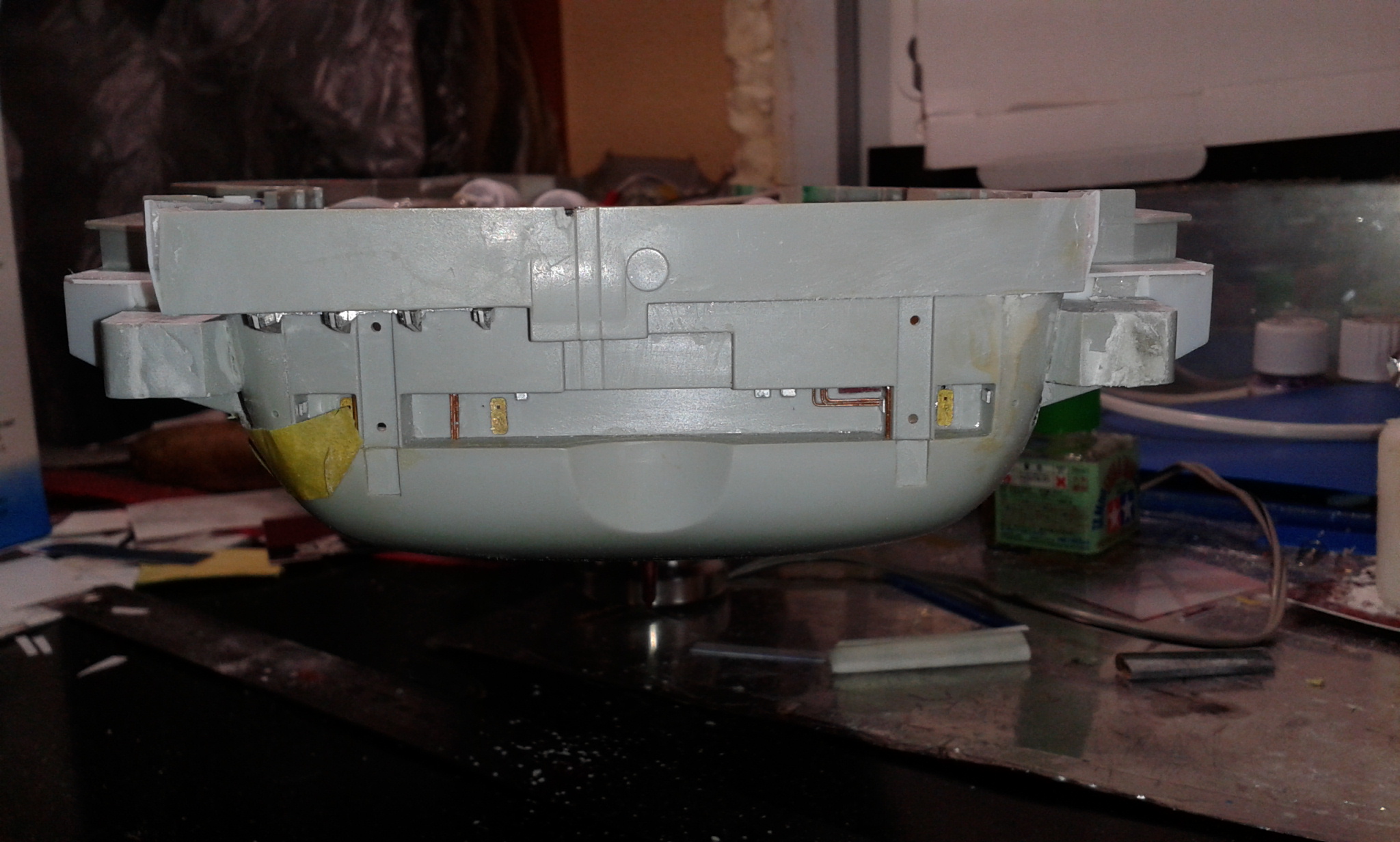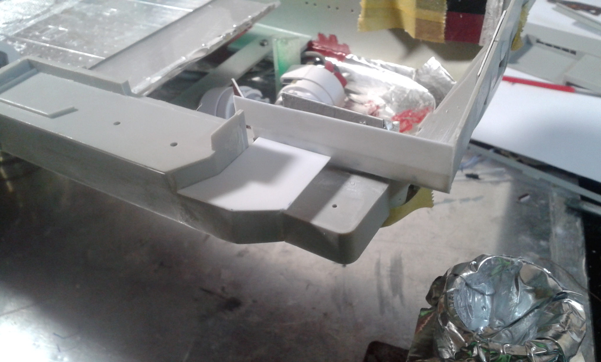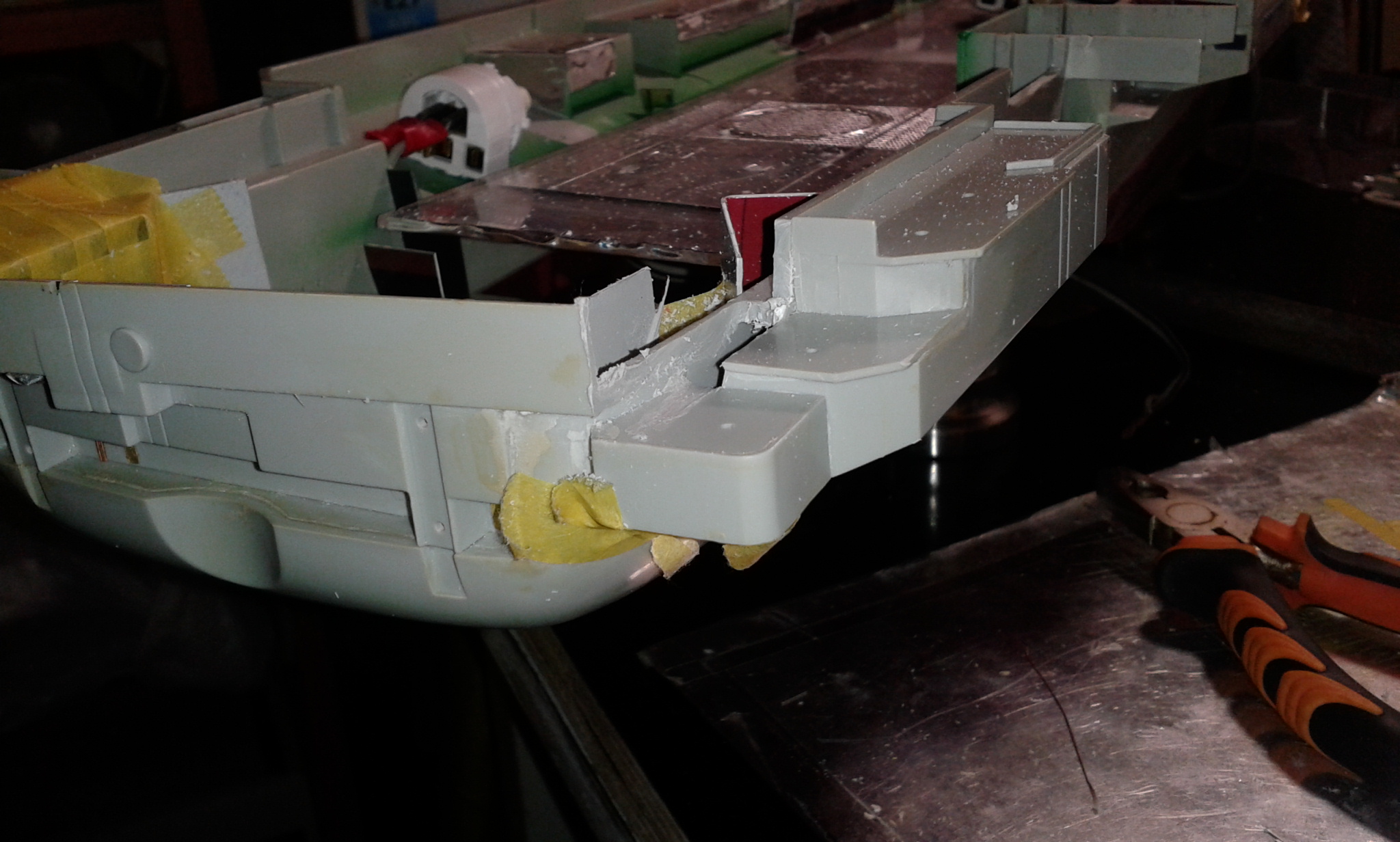 Думал честно говоря все эти отсеки переделать и дело там не только в размере площадки но и в других частях корпуса геометрия неправильная, высота. Перепиливать все это сейчас будет тяжеловато, так как отсеки уже приклеены к корпусу, если до сборки то можно было бы  отделаться малой кровью по сравнению с тем что сейчас нужно будет сделать.